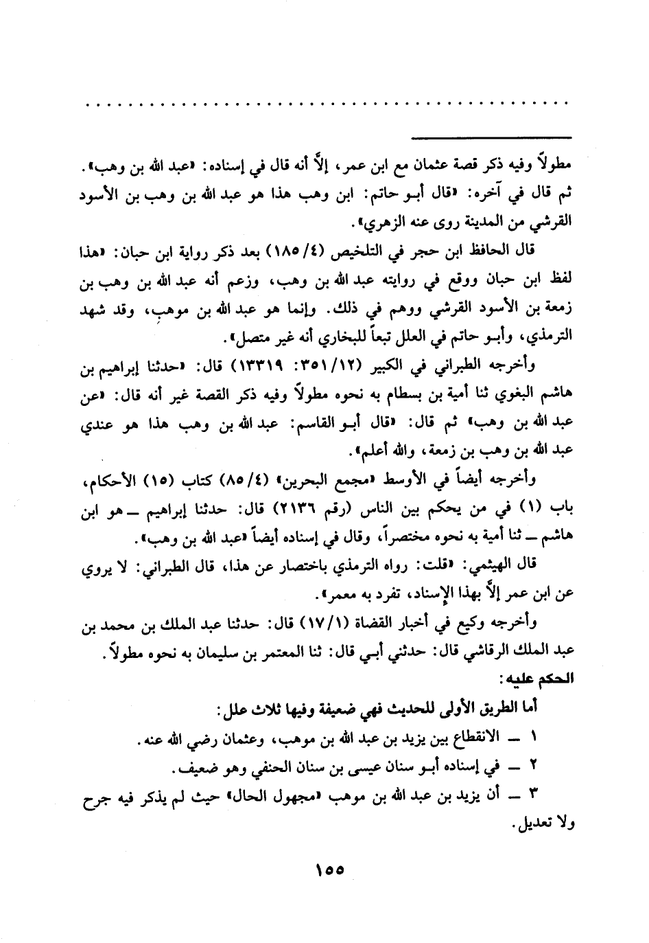 قال الحافظ ابن حجر في التلخيص (4/ 185) بعد ذكر رواية ابن حبّان: "هذا لفظ ابن حبّان ووقع في روايته عبد الله بن وهب، وزعم أنه عبد الله بن وهب بن زمعة بن الأسود القرشي ووهم في ذلك. وإنما هو عبد الله بن موهبِ، وقد شهد الترمذي، وأبو حاتم في العلل تبعًا للبخاري أنه غير متصل".