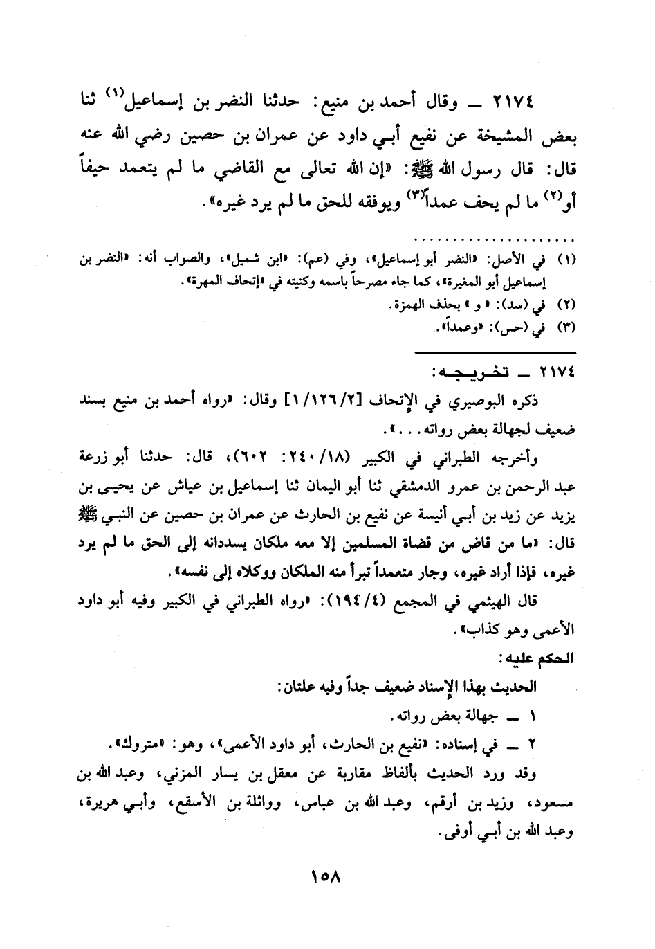 2174 - وَقَالَ أَحْمَدُ بْنُ مَنِيعٍ حَدَّثَنَا النَّضْرُ بْنُ إِسْمَاعِيلَ ثنا بَعْضُ الْمَشْيَخَةِ عَنْ نُفَيْعٍ أَبِي دَاوُدَ عَنْ عِمْرَانَ بْنِ حُصَيْنٍ رَضِيَ الله عَنْهُ قَالَ قَالَ رَسُولُ اللَّهِ صَلَّى اللَّهُ عَلَيْهِ وَسَلَّمَ إِنَّ §اللَّهَ تَعَالَى مَعَ الْقَاضِي مَا لَمْ يَتَعَمَّدْ حَيْفًا أَوْ مَا لَمْ يَحِفْ عَمْدًا وَيُوَفِّقُهُ لِلْحَقِّ مَا لَمْ يُرِدْ غَيْرَهُ
