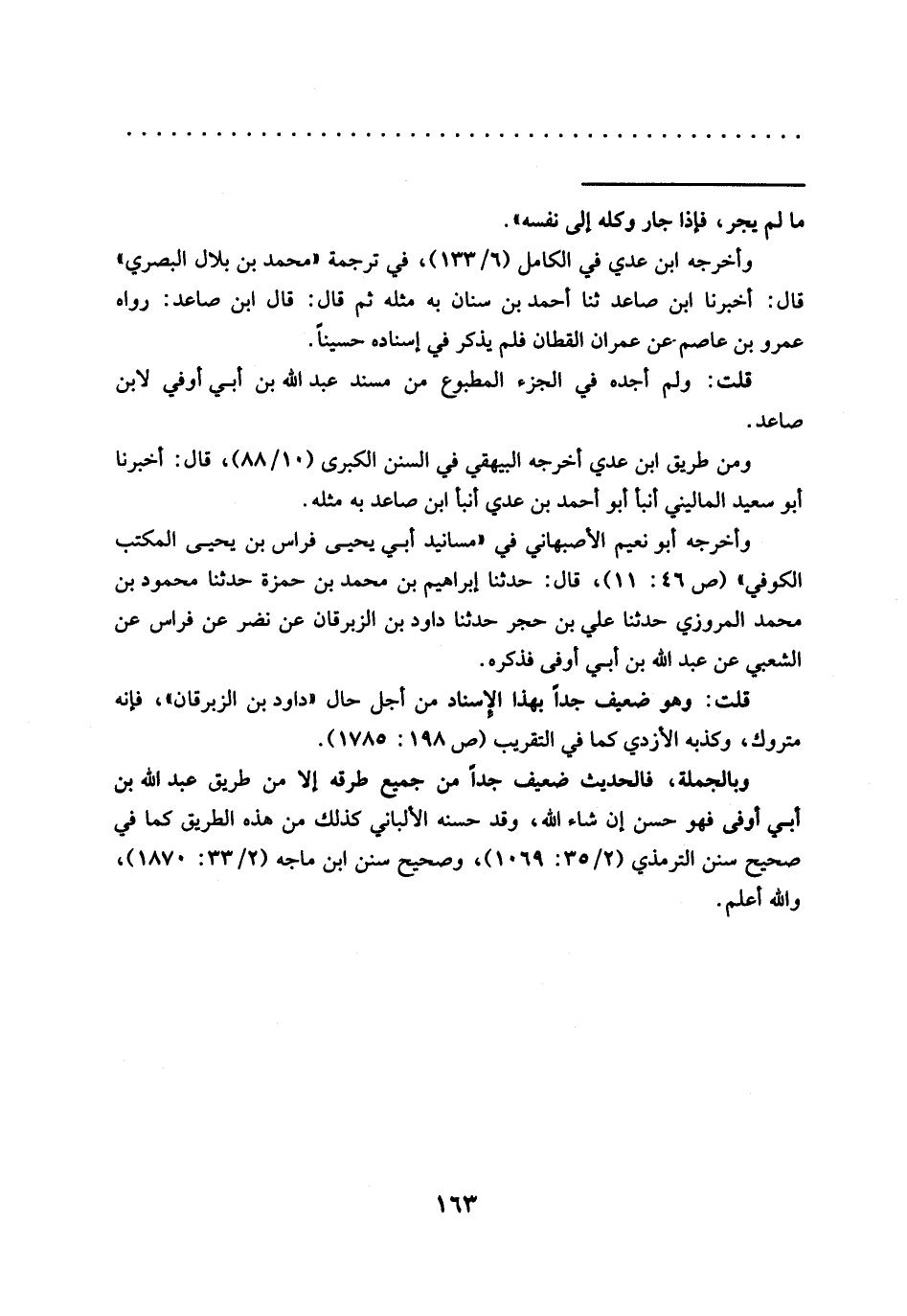 وبالجملة، فالحديث ضعيف جدًا من جميع طرقه إلا من طريق عبد الله بن أبي أوفى فهو حسن إن شاء الله، وقد حسنه الألباني كذلك من هذه الطريق كما في صحيح سنن الترمذي (2/ 35: 1069)، وصحيح سنن ابن ماجه (2/ 33: 1870)، والله أعلم.