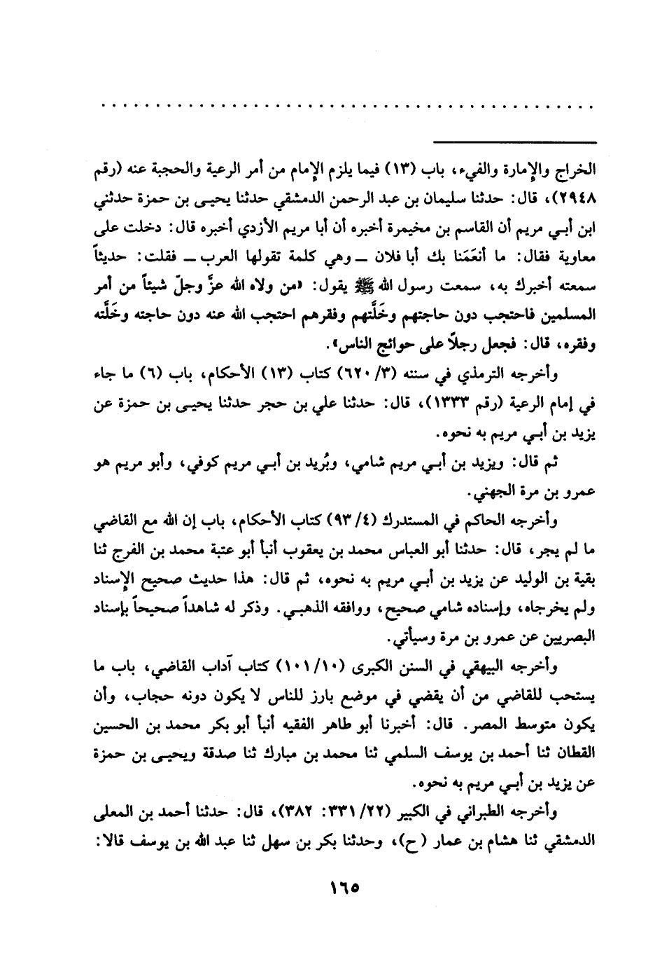 = الخراج والإمارة والفيء، باب (13) فيما يلزم الإِمام من أمر الرعية والحجبة عنه (رقم 2948)، قال: حدّثنا سليمان بن عبد الرحمن الدمشقي حدّثنا يحيى بن حمزة حدثني ابن أبي مريم أن القاسم بن مخيمرة أخبره أن أبا مريم الأزدي أخبره قال: دخلت على معاوية فقال: ما أنعَمَنا بك أبا فلان -وهي كلمة تقولها العرب- فقلت: حديثًا سمعته أخبرك به، سمعت رسول الله -صلى الله عليه وسلم- يقول: "من ولاه الله عزَّ وجلّ شيئًا من أمر المسلمين فاحتجب دون حاجتهم وخَلَّتهم وفقرهم احتجب الله عنه دون حاجته وخَلَّته وفقره، قال: فجعل رجلًا على حوائج الناس".