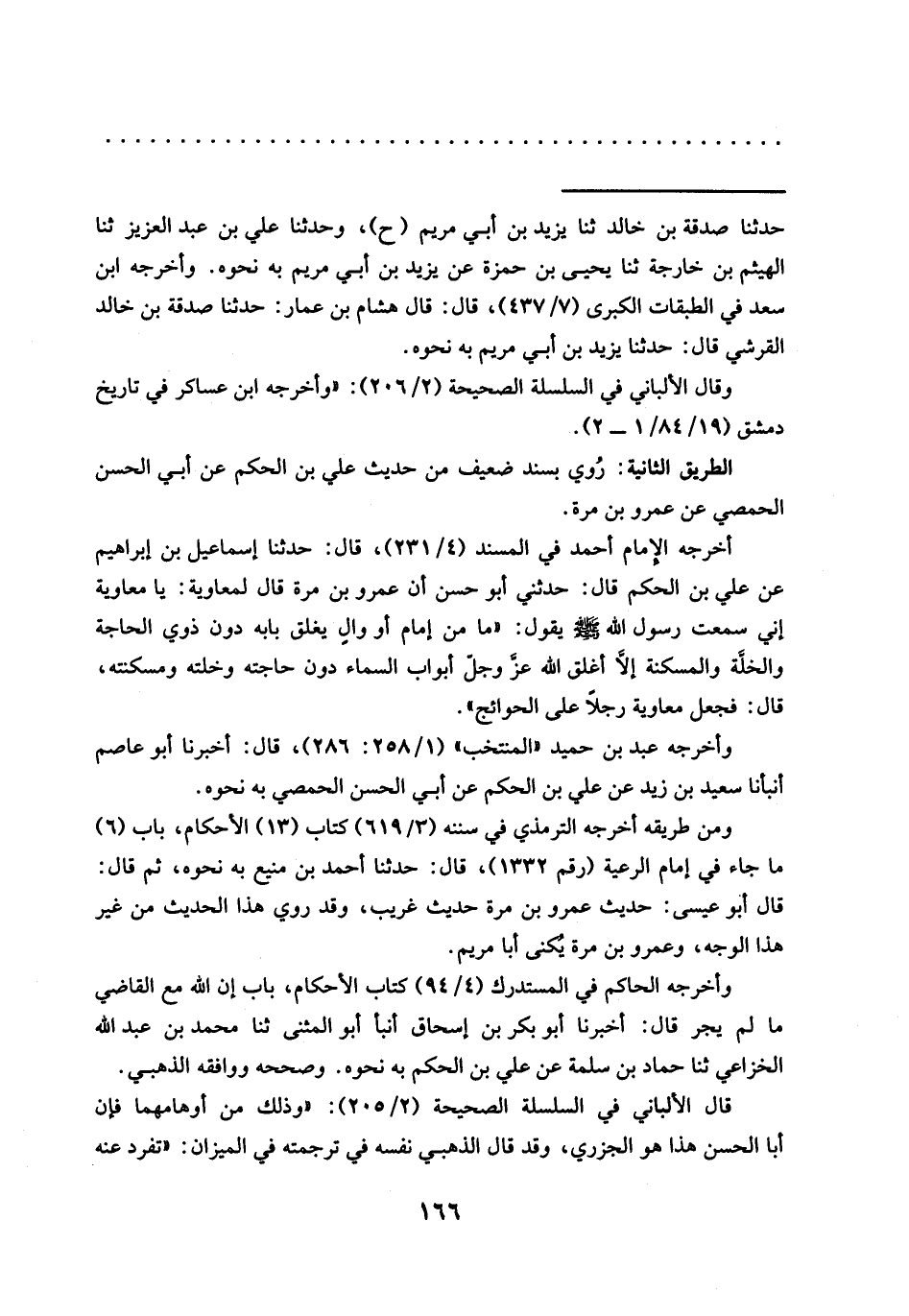 أخرجه الإِمام أحمد في المسند (4/ 231)، قال: حدّثنا إسماعيل بن إبراهيم عن علي بن الحكم قال: حدثني أبو حسن أن عمرو بن مرة قال لمعاوية: يا معاوية إني سمعت رسول الله -صلى الله عليه وسلم- يقول: "ما من إمام أو والٍ يغلق بابه دون ذوي الحاجة والخلَّة والمسكنة إلَّا أغلق الله عزَّ وجلَّ أبواب السماء دون حاجته وخلته ومسكنته، قال: فجعل معاوية رجلًا على الحوائج".