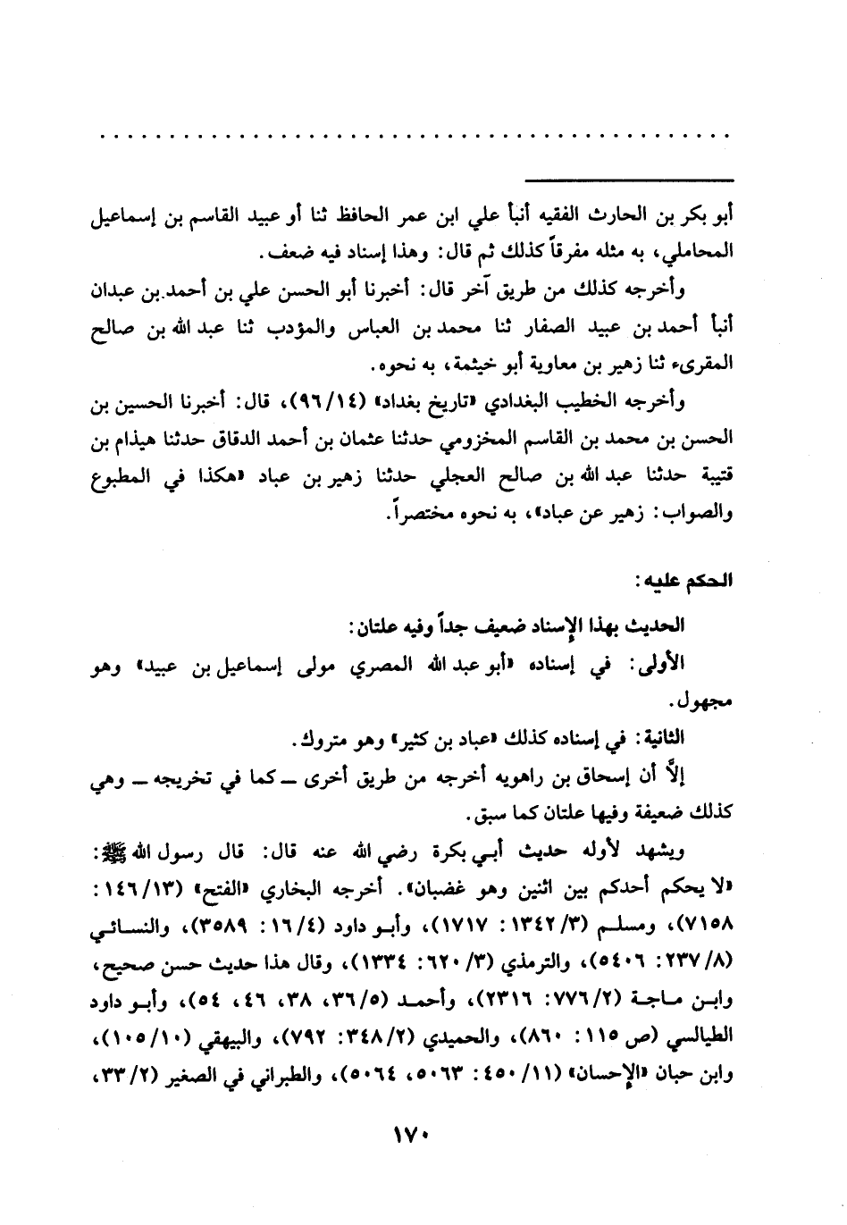 = أبو بكر بن الحارث الفقيه أنبأ علي ابن عمر الحافظ ثنا أو عبيد القاسم بن إسماعيل المحاملي، به مثله مفرقًا كذلك ثم قال: وهذا إسناد فيه ضعف.