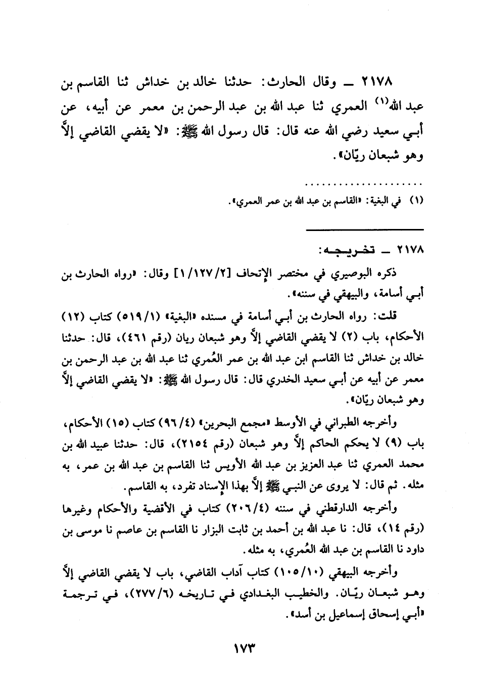 2178 - وَقَالَ الْحَارِثُ حَدَّثَنَا خَالِدُ بْنُ خِدَاشٍ ثنا الْقَاسِمُ بْنُ عَبْدِ اللَّهِ الْعُمَرِيُّ ثنا عَبْدُ اللَّهِ بْنُ عَبْدِ الرَّحْمَنِ بْنِ مَعْمَرٍ عَنْ أَبِيهِ عَنْ أَبِي سَعِيدٍ رَضِيَ الله عَنْهُ قَالَ قَالَ رَسُولُ اللَّهِ صَلَّى اللَّهُ عَلَيْهِ وَسَلَّمَ §لَا يَقْضِي الْقَاضِي إِلَّا وَهُوَ شَبْعَانُ رَيَّانُ
