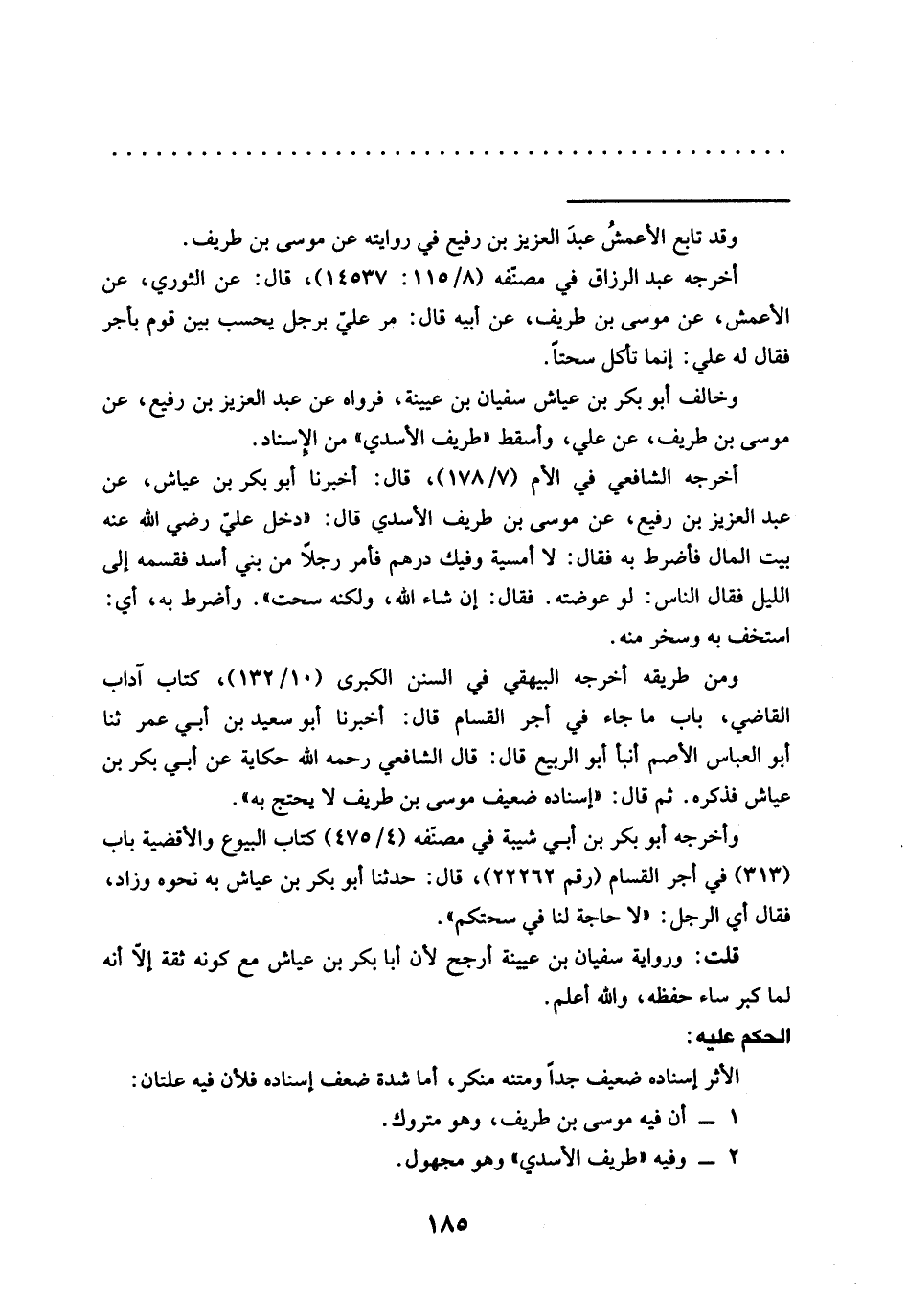 ومن طريقه أخرجه البيهقي في السنن الكبرى (10/ 132)، كتاب آداب القاضي، باب ما جاء في أجر القسام قال: أخبرنا أبوسعيد بن أبي عمر ثنا أبو العباس الأصم أنبأ أبو الربيع قال: قال الشافعي رحمه الله حكايته عن أبي بكر بن عياش فذكره. ثم قال: "إسناده ضعيف موسى بن طريف لا يحتج به".