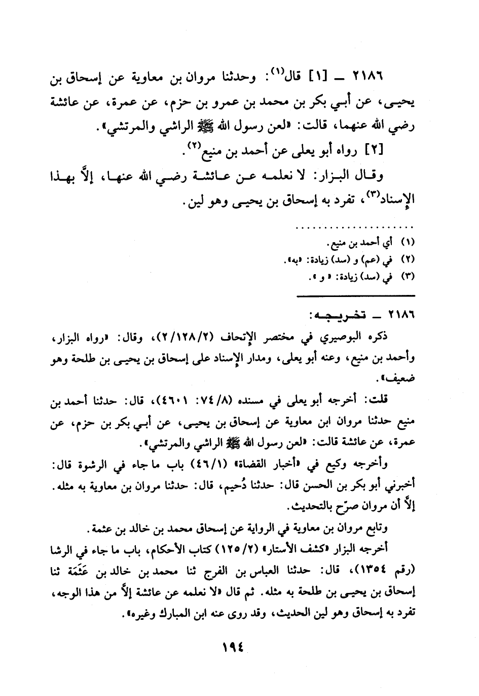 2186 - قَالَ وَحَدَّثَنَا مَرْوَانُ بْنُ مُعَاوِيَةَ عَنْ إِسْحَاقَ بْنِ يَحْيَى عَنْ أَبِي بَكْرِ بْنِ مُحَمَّدِ بْنِ عَمْرِو بْنِ حَزْمٍ عَنْ عَمْرَةَ عَنْ عَائِشَةَ رَضِيَ الله عَنْهَا قَالَتْ §لَعَنَ رَسُولُ اللَّهِ صَلَّى اللَّهُ عَلَيْهِ وَسَلَّمَ الرَّاشِيَ وَالْمُرْتَشِيَ