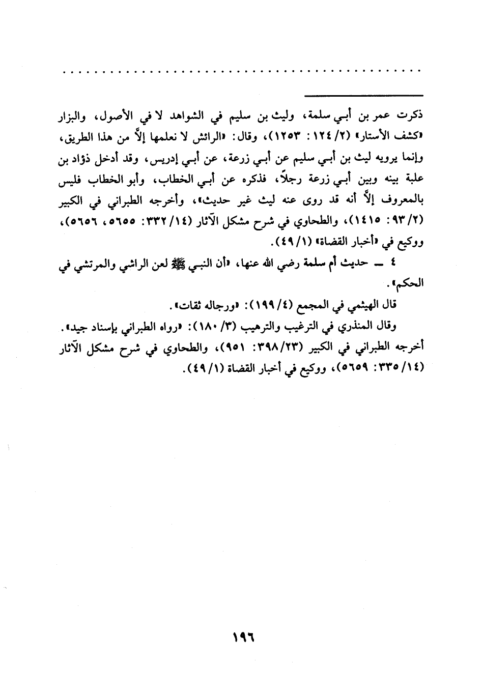 = ذكرت عمر بن أبي سلمة، وليث بن سليم في الشواهد لا في الأصول، والبزار "كشف الأستار" (2/ 124: 1253)، وقال: "الرائش لا نعلمها إلَّا من هذا الطريق، وإنما يرويه ليث بن أبي سليم عن أبي زرعة، عن أبي إدريس، وقد أدخل ذؤاد بن علبة بينه وبين أبي زرعة رجلًا، فذكره عن أبي الخطاب، وأبو الخطاب فليس بالمعروف إلَّا أنه قد روى عنه ليث غير حديث"، وأخرجه الطبراني في الكبير (2/ 93: 1415)، والطحاوي في شرح مشكل الآثار (14/ 332: 5655، 5656)، ووكيع في "أخبار القضاة" (1/ 49).