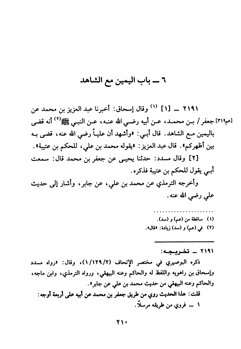2191 - وَقَالَ إِسْحَاقُ أَخْبَرَنَا عَبْدُ الْعَزِيزِ بْنُ مُحَمَّدٍ عَنْ جَعْفَرِ بْنِ مُحَمَّدٍ عَنْ أَبِيهِ رَضِيَ الله عَنْهُ عَنِ النَّبِيِّ صَلَّى اللَّهُ عَلَيْهِ وَسَلَّمَ أَنَّهُ §قَضَى بِالْيَمِينِ مَعَ الشَّاهِدِ قَالَ أَبِي وَأَشْهَدُ أَنَّ عَلِيًّا رَضِيَ الله عَنْهُ قَضَى بِهِ بَيْنَ أَظْهُرِكُمْ قَالَ عَبْدُ الْعَزِيزِ يَقُولُهُ مُحَمَّدُ بْنُ عَلِيٍّ لِلْحَكَمِ بْنِ عُتَيْبَةَ