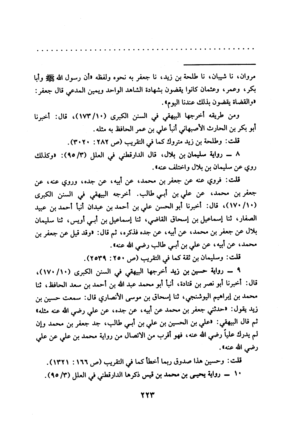 9 - رواية حسين بن زيد أخرجها البيهقي في السنن الكبرى (10/ 170)، قال: أخبرنا أبو نصر بن قتادة، أنبأ أبو محمَّد عبد الله بن أحمد بن سعد الحافظ، ثنا محمَّد بن إبراهيم اليوشنجي، ثنا إسحاق بن موسى الأنصاري قال: سمعت حسين بن زيد يقول: "حَدَّثَنِي جَعْفَرُ بْنُ محمَّد عَنْ أَبِيهِ، عَنْ جَدِّهِ، عن علي رضي الله عنه مثله" ثم قال البيهقي: "علي بن الحسين بن علي بن أبي طالب، جد جعفر بن محمَّد وإن لم يدرك عليًا رضي الله عنه، فهو أقرب من الاتصال من رواية محمَّد بن علي عن علي رضي الله عنه".