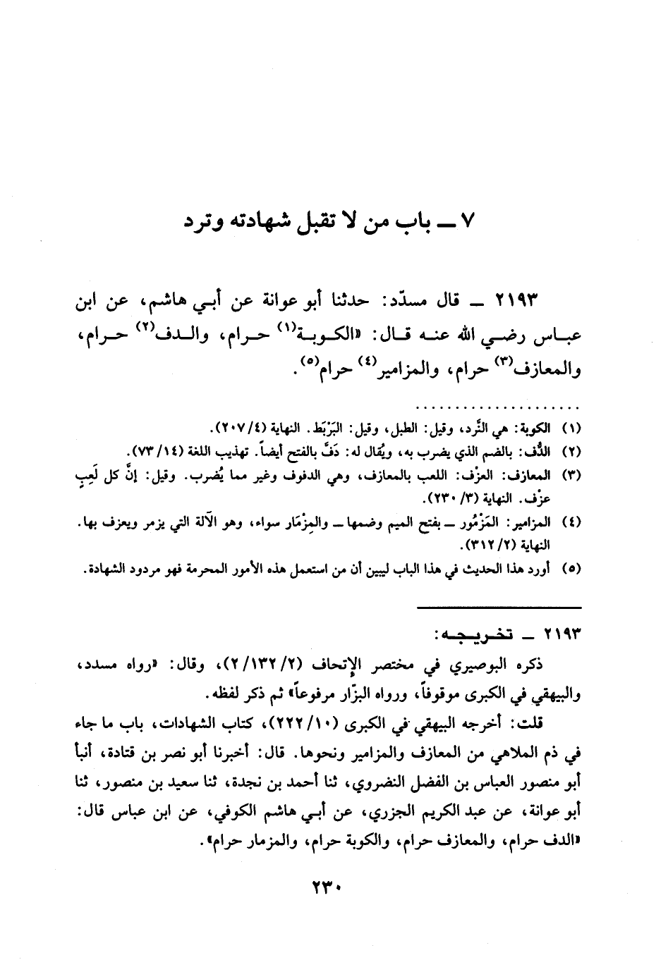2193 - قَالَ مُسَدَّدٌ حَدَّثَنَا أَبُو عَوَانَةَ عَنْ أَبِي هَاشِمٍ عَنِ ابْنِ عَبَّاسٍ رَضِيَ الله عَنْهُ قَالَ §الْكُوبَةُ حَرَامٌ وَالدُّفُّ حَرَامٌ وَالْمَعَازِفُ حَرَامٌ وَالْمَزَامِيرُ حَرَامٌ
