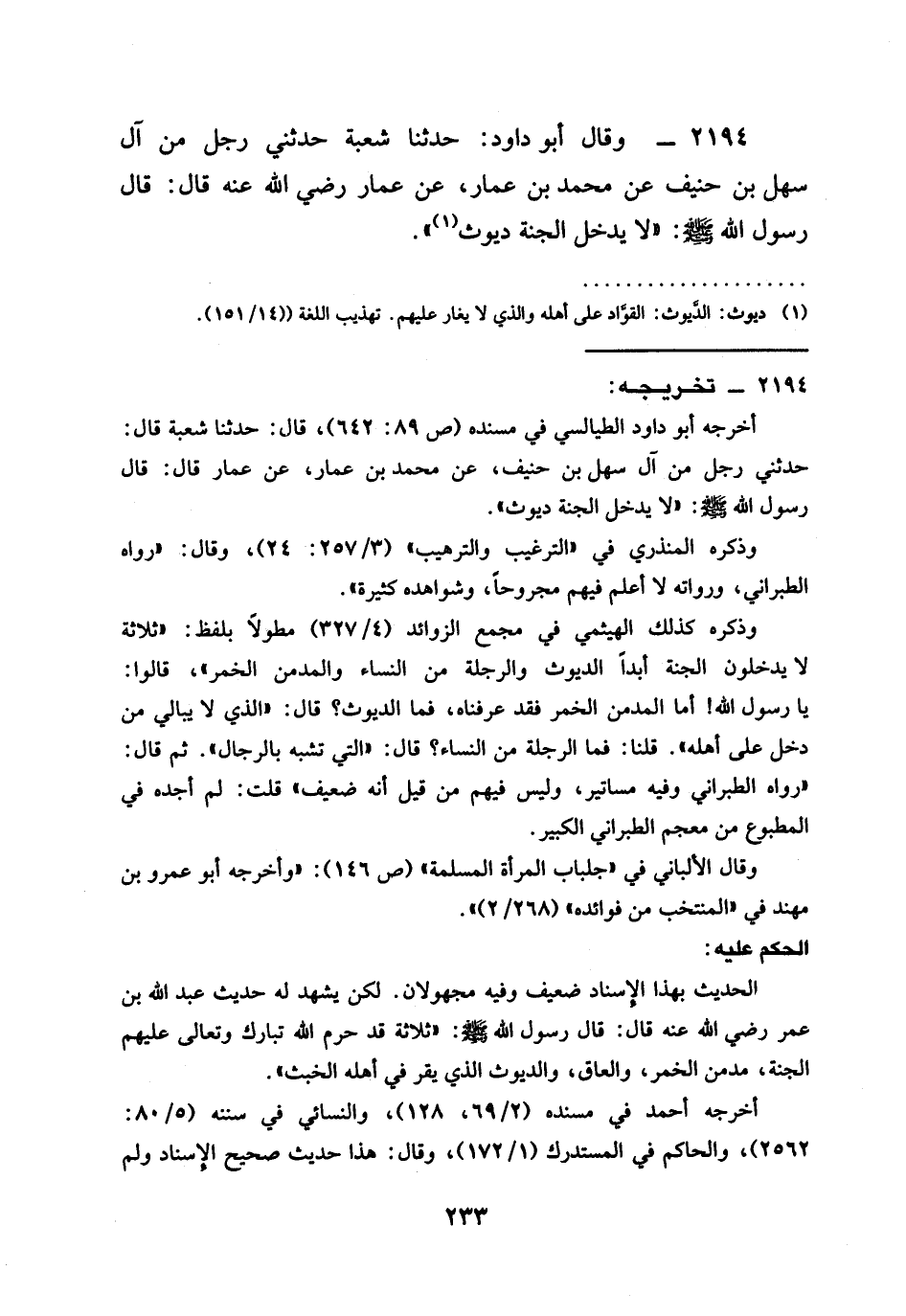 2194 - وَقَالَ أَبُو دَاوُدَ حَدَّثَنَا شُعْبَةُ حَدَّثَنِي رَجُلٌ مِنْ آلِ سَهْلِ بْنِ حُنَيْفٍ عَنْ مُحَمَّدِ بْنِ عَمَّارٍ عَنْ عَمَّارٍ رَضِيَ الله عَنْهُ قَالَ قَالَ رَسُولُ اللَّهِ صَلَّى اللَّهُ عَلَيْهِ وَسَلَّمَ §لَا يَدْخُلُ الْجَنَّةَ دَيُّوثٌ