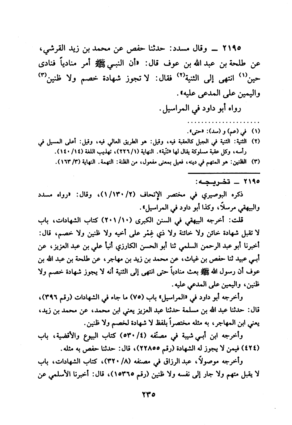 2195 - وَقَالَ مُسَدَّدٌ حَدَّثَنَا حَفْصٌ عَنْ مُحَمَّدِ بْنِ زَيْدٍ الْقُرَشِيِّ عَنْ طَلْحَةَ بْنِ عَبْدِ اللَّهِ بْنِ عَوْفٍ قَالَ إِنَّ النَّبِيَّ صَلَّى اللَّهُ عَلَيْهِ وَسَلَّمَ أَمَرَ مُنَادِيًا فَنَادَى حِينَ انْتَهَى إِلَى الثَّنِيَّةِ فَقَالَ §لَا تَجُوزُ شَهَادَةُ خَصْمٍ وَلَا رَوَاهُ أَبُو دَاوُدَ في المراسيل ظنين واليمين على المدعى عليه