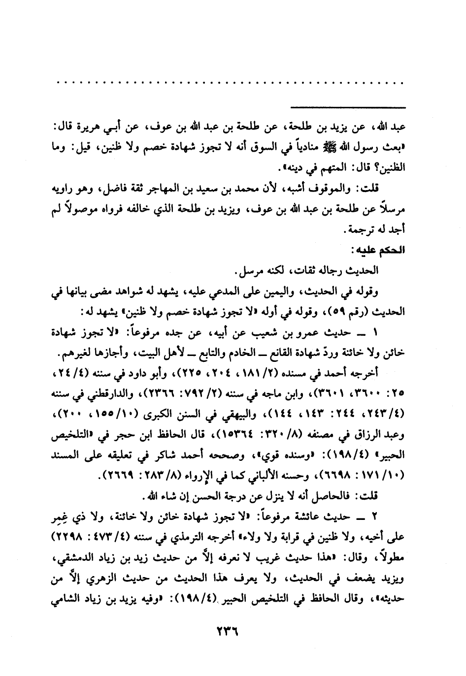 = عبد الله، عن يزيد بن طلحة، عَنْ طَلْحَةَ بْنِ عَبْدِ اللَّهِ بْنِ عَوْفٍ، عن أبي هريرة قَالَ: "بَعَثَ رَسُولُ اللَّهِ -صَلَّى اللَّهُ عَلَيْهِ وسلم- مناديًا في السوق أنه لا تجوز شهادة خصم ولا ظنين، قيل: وما الظنين؟ قال: المتهم في دينه".