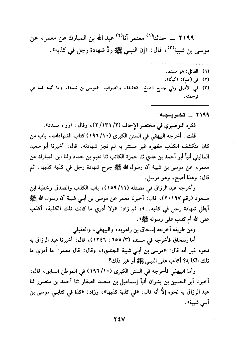 2199 - حَدَّثَنَا مُعْتَمِرٌ أنا عَبْدُ اللَّهِ بْنُ الْمُبَارَكِ عن معمر عم مُوسَى بْنِ شَيْبَةَ قَالَ إِنَّ النَّبِيَّ صَلَّى اللَّهُ عَلَيْهِ وَسَلَّمَ §رَدَّ شَهَادَةَ رَجُلٍ فِي كَذْبَةٍ