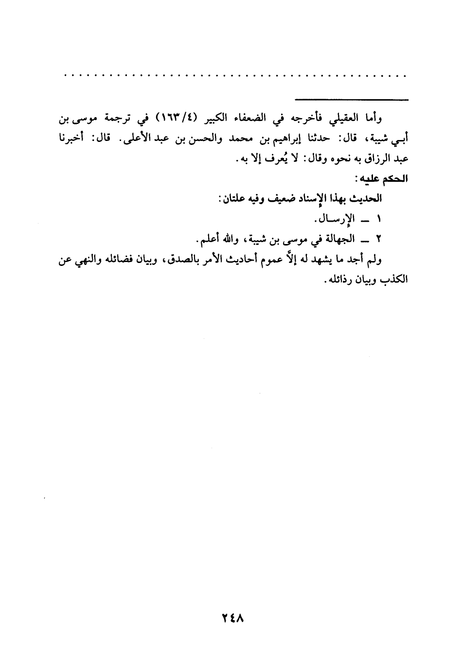 = وأما العقيلي فأخرجه في الضعفاء الكبير (4/ 163) في ترجمة موسى بن أبي شيبة، قال: حدّثنا إبراهيم بن محمَّد والحسن بن عبد الأعلى. قال: أخبرنا عبد الرزاق به نحوه وقال: لا يُعرف إلا به.