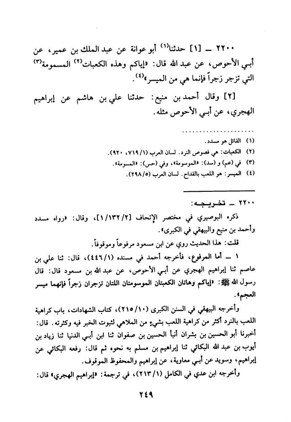 2200 - حَدَّثَنَا أَبُو عَوَانَةَ عَنْ عَبْدِ الْمَلِكِ بْنِ عُمَيْرٍ عَنْ أَبِي الْأَحْوَصِ عَنْ عَبْدِ اللَّهِ قَالَ §إِيَّاكُمْ وَهَذِهِ الْكَعْبَاتِ الْمَسْمُومَةَ الَّتِي تُزْجَرُ زَجْرًا فَإِنَّمَا هِيَ مِنَ الْمَيْسِرِ وَقَالَ أَحْمَدُ بْنُ مَنِيعٍ حَدَّثَنَا عَلِيُّ بْنُ هَاشِمٍ عَنْ إِبْرَاهِيمَ الْهَجَرِيِّ عَنْ أَبِي الْأَحْوَصِ مِثْلَهُ