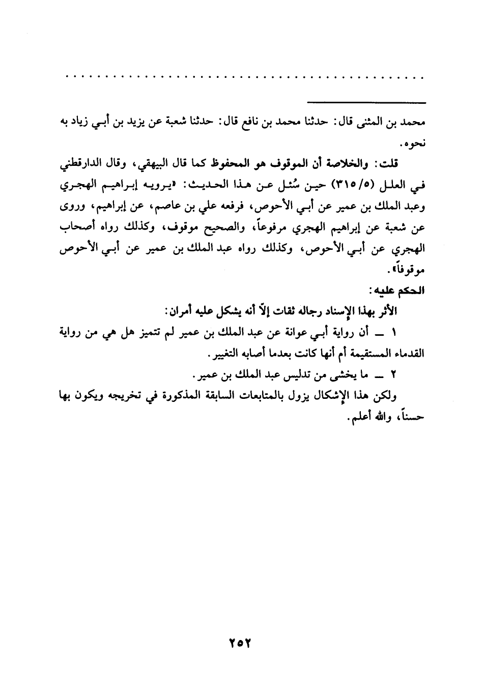 قلت: والخلاصة أن الموقوف هو المحفوظ كما قال البيهقي، وقال الدارقطني في العلل (5/ 315) حين سُئل عن هذا الحديث: "يرويه إبراهيم الهجري وعبد الملك بن عمير عن أبي الأحوص، فرفعه علي بن عاصم، عن إبراهيم، وروى عن شعبة عن إبراهيم الهجري مرفوعًا، والصحيح موقوف، وكذلك رواه أصحاب الهجري عن أبي الأحوص، وكذلك رواه عَبْدِ الْمَلِكِ بْنِ عُمَيْرٍ عَنْ أَبِي الْأَحْوَصِ موقوفًا".