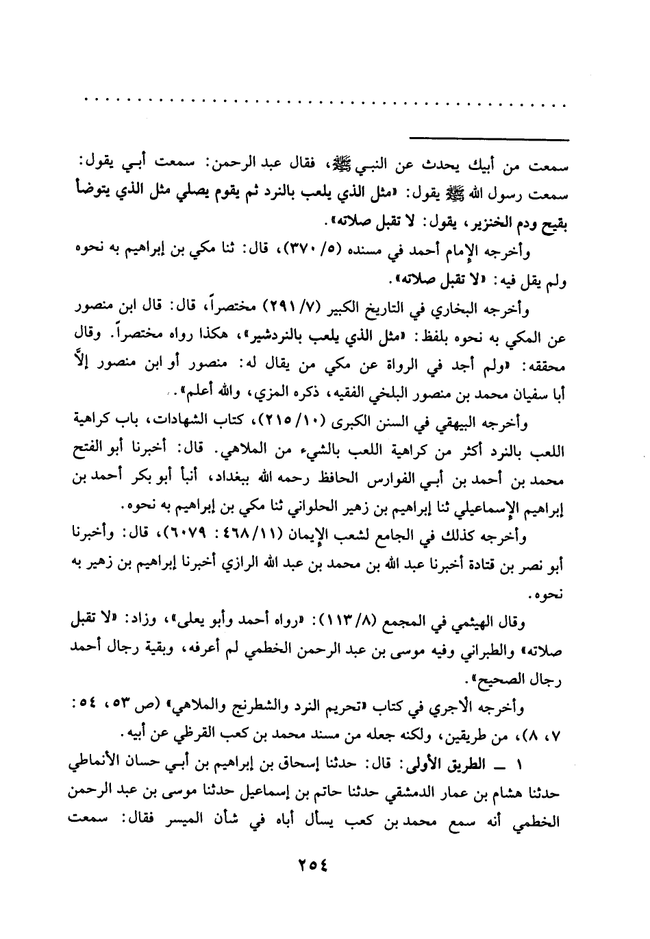 = سمعت من أبيك يُحَدِّثُ عَنِ النَّبِيِّ -صَلَّى اللَّهُ عَلَيْهِ وَسَلَّمَ-، فقال عبد الرحمن: سَمِعْتُ أَبِي يَقُولُ: سَمِعْتُ رَسُولَ اللَّهِ -صَلَّى اللَّهُ عَلَيْهِ وَسَلَّمَ- يَقُولُ: "مَثَلُ الَّذِي يَلْعَبُ بالنرد ثم يقوم يصلي مثل الذي يتوضأ بقيح ودم الخنزير، يقول: لا تقبل صلاته".