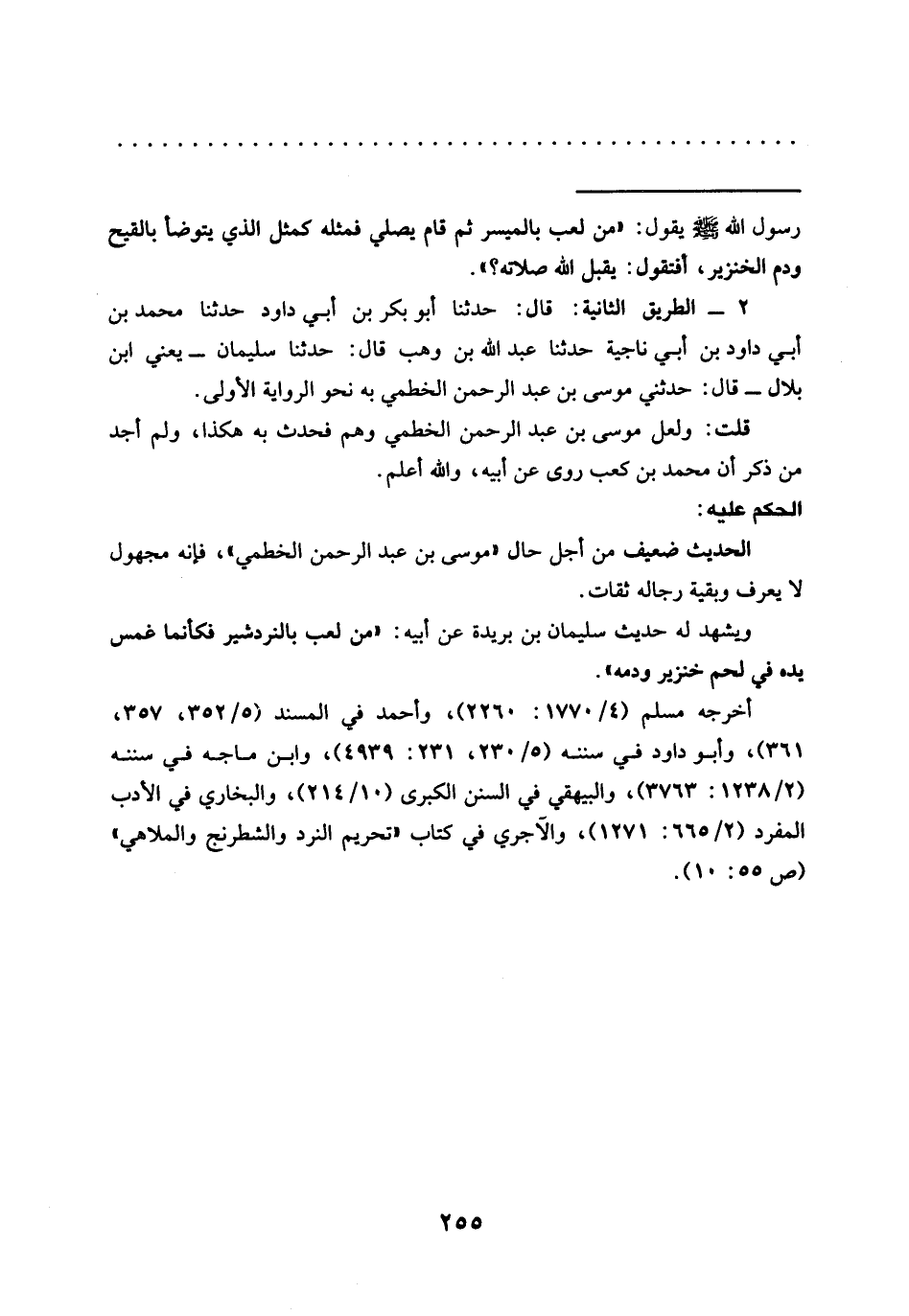 أخرجه مسلم (4/ 1770: 2260)، وأحمد في المسند (5/ 352، 357، 361)، وأبو داود في سننه (5/ 230، 231: 4939)، وابن ماجه في سننه (2/ 1238: 3763)، والبيهقي في السنن الكبرى (10/ 214)، والبخاري في الأدب المفرد (2/ 665: 1271)، والآجري في كتاب "تحريم النرد والشطرنج والملاهي" (ص 55: 10).
