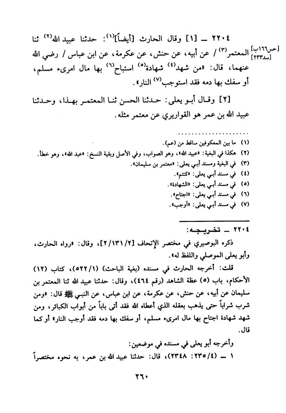 2204 - وقال الحارث أيضاً حدثنا عبيد اللَّهِ ثنا الْمُعْتَمِرُ عَنْ أَبِيهِ عَنْ حَنَشٍ عَنْ عِكْرِمَةَ عَنِ ابن عباس رَضِيَ الله عَنْهما قَالَ §مَنْ شَهِدَ شَهَادَةً اسْتَبَاحَ بِهَا مَالَ امْرِئٍ مُسْلِمٍ أَوْ سَفَكَ بِهَا دَمَهُ فَقَدِ اسْتَوْجَبَ النَّارَ وَقَالَ أَبُو يَعْلَى حَدَّثَنَا الْحَسَنُ ثنا المعتمر بهذا وحدثنا عُبَيْدِ اللَّهِ بْنِ عُمَرَ هُوَ الْقَوَارِيرِيُّ عَنْ مُعْتَمِرٍ مِثْلَهُ