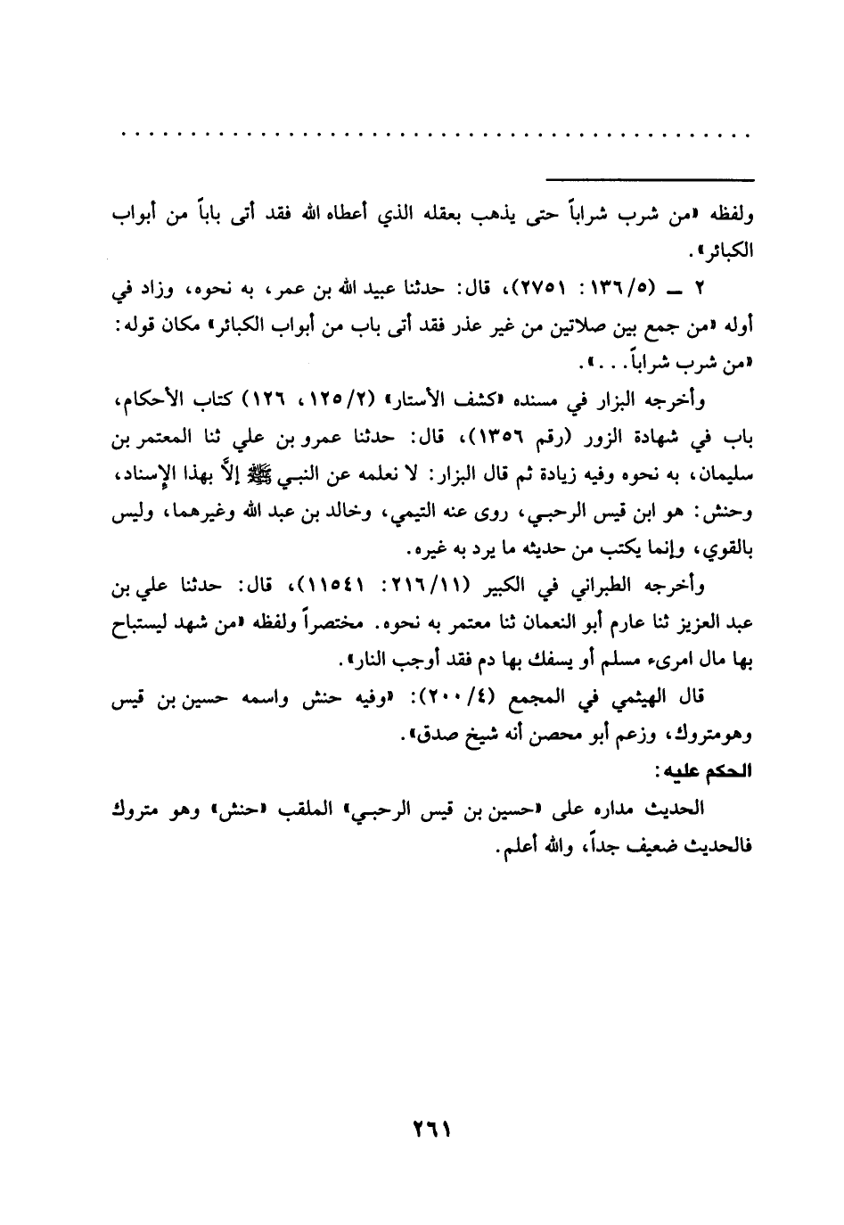 2 - (5/ 136: 2751)، قال: حدّثنا عبيد الله بن عمر، به نحوه، وزاد في أوله "من جمع بين صلاتين من غير عذر فقد أتى باب من أبواب الكبائر" مكان قوله: "من شرب شرابًا ... ".
