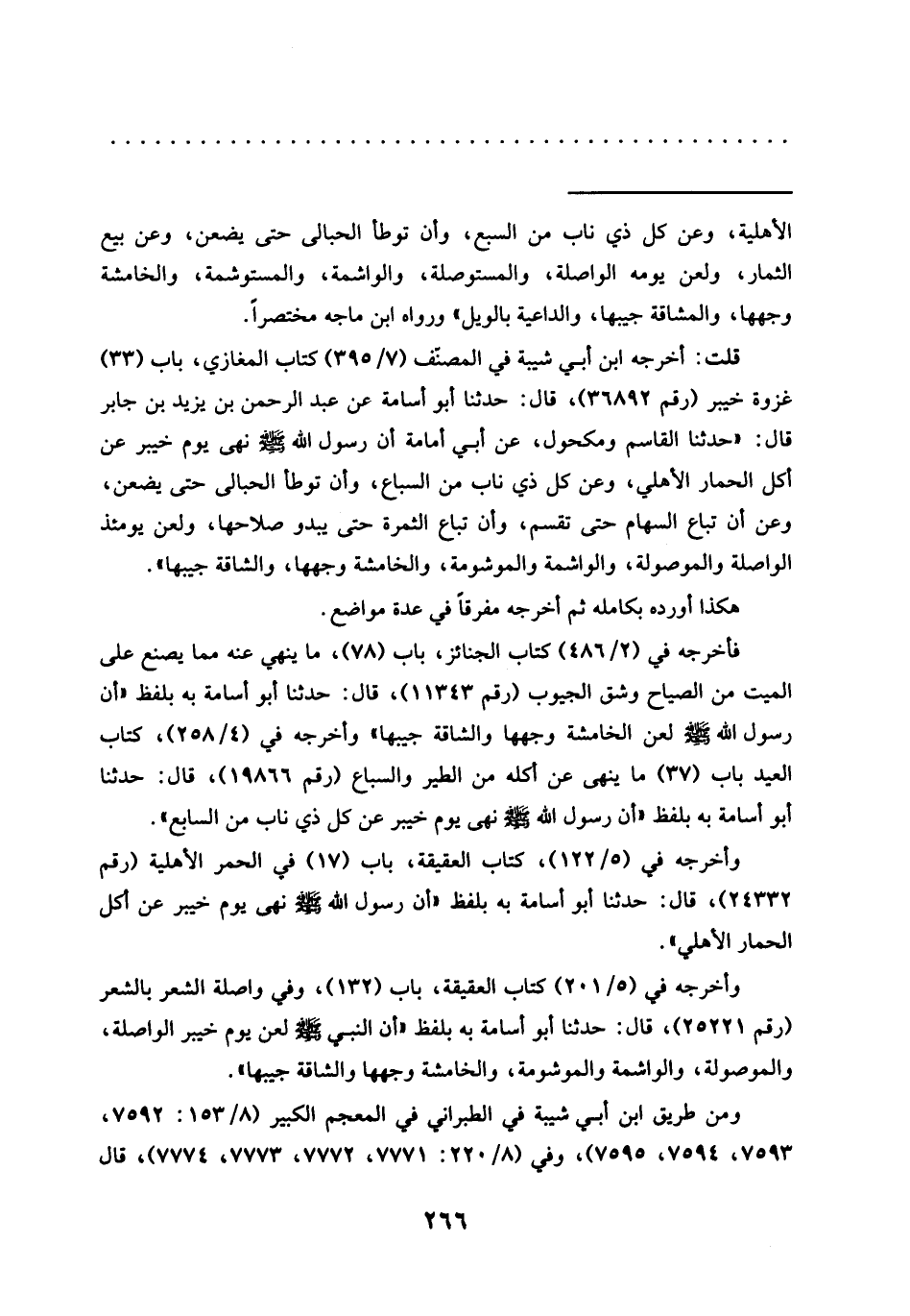 قلت: أخرجه ابن أبي شيبة في المصنف (7/ 395) كتاب المغازي، باب (33) غزوة خيبر (رقم 36892)، قال: حَدَّثَنَا أَبُو أُسَامَةَ عَنْ عَبْدِ الرَّحْمَنِ بْنِ يزيد بن جابر قال: "حدّثنا الْقَاسِمُ وَمَكْحُولٌ، عَنْ أَبِي أُمَامَةَ أَنَّ رَسُولَ اللَّهِ -صَلَّى اللَّهُ عَلَيْهِ وَسَلَّمَ- نَهَى يَوْمَ خَيْبَرَ عَنْ أَكْلِ الْحِمَارِ الْأَهْلِيِّ، وَعَنْ كُلِّ ذي ناب من السباع، وأن توطأ الحبالى حتى يضعن، وعن أن تباع السهام حتى تقسم، وأن تباع الثمرة حتى يبدو صلاحها, ولعن يومئذ الواصلة والموصولة، والواشمة والموشومة، والخامشة وجهها، والشاقة جيبها".
