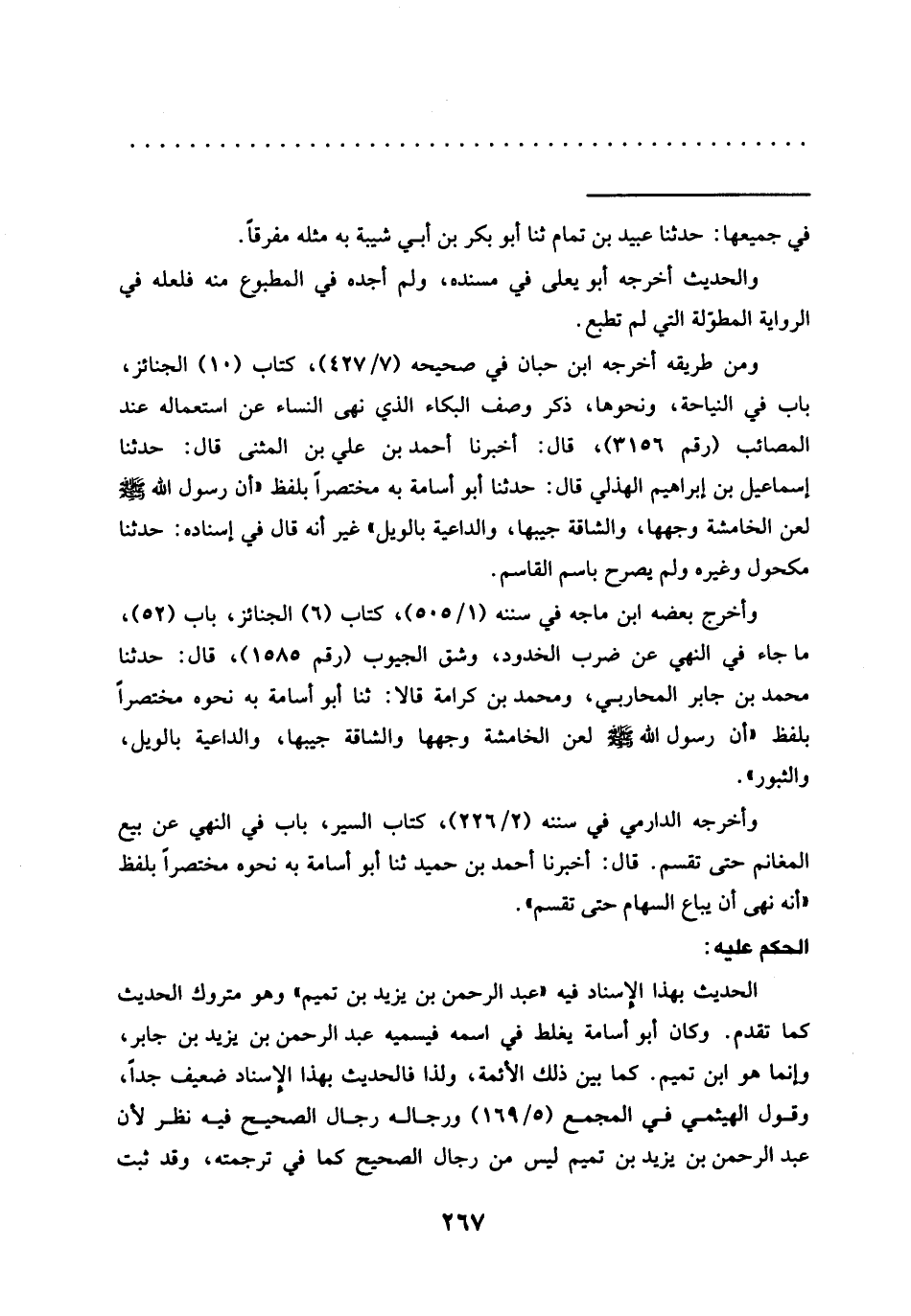 ومن طريقه أخرجه ابن حبّان في صحيحه (7/ 427)، كتاب (10) الجنائز، باب في النياحة، ونحوها، ذكر وصف البكاء الذي نهى النساء عن استعماله عند المصائب (رقم 3156)، قال: أخبرنا أحمد بن علي بن المثنى قال: حدّثنا إسماعيل بن إبراهيم الهذلي قال: حدّثنا أبو أسامة به مختصرًا بِلَفْظِ "أَنَّ رَسُولَ اللَّهِ -صَلَّى اللَّهُ عَلَيْهِ وسلم- لعن الخامشة وجهها، والشاقة جيبها، والداعية بالويل" غير أنه قال في إسناده: حدّثنا مكحول وغيره ولم يصرح باسم القاسم.