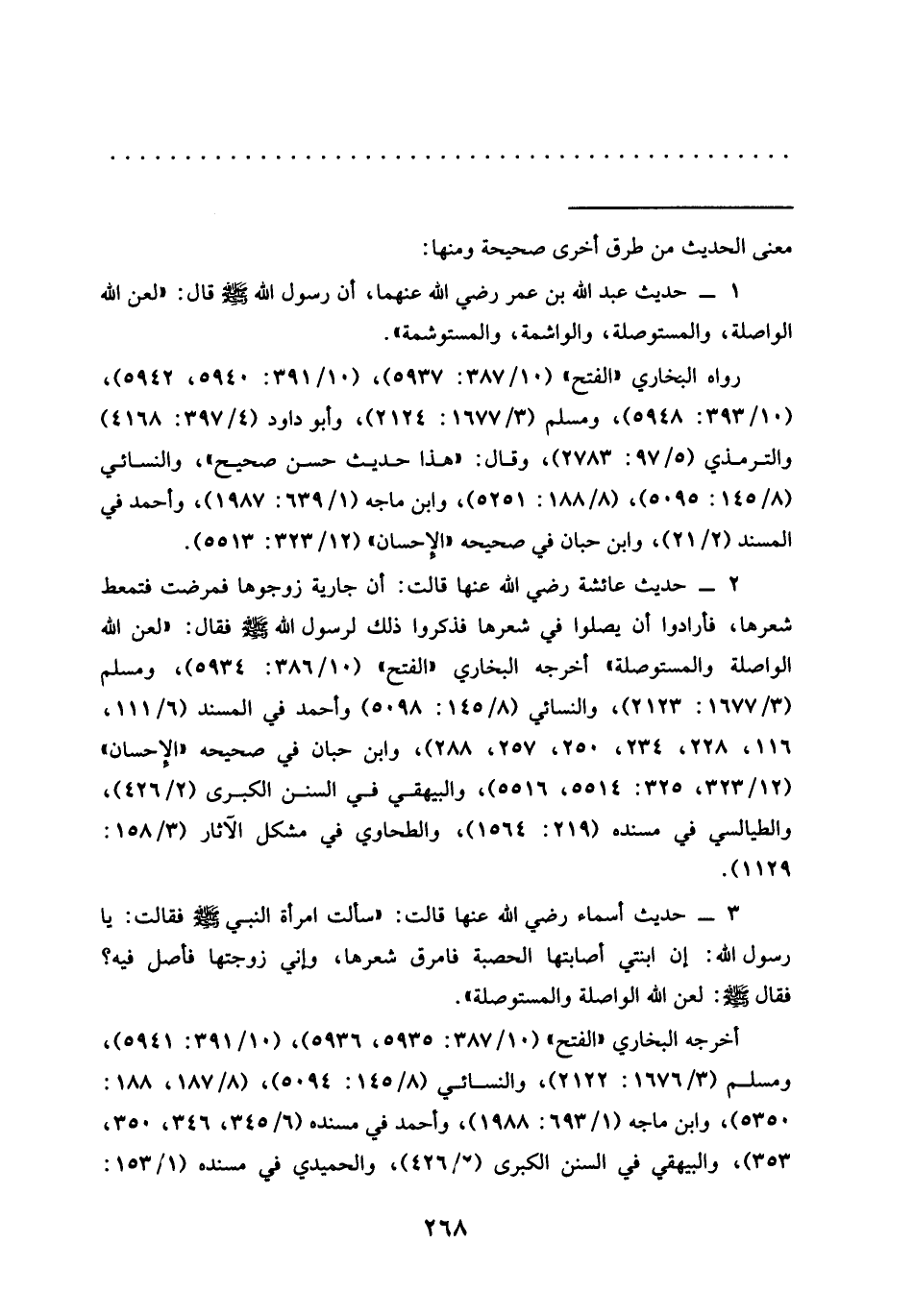 2 - حديث عائشة رضي الله عنها قالت: أن جارية زوجوها فمرضت فتمعط شعرها، فأرادوا أن يصلوا في شعرها فذكروا ذَلِكَ لِرَسُولِ اللَّهِ -صَلَّى اللَّهُ عَلَيْهِ وَسَلَّمَ- فقال: "لعن الله الواصلة والمستوصلة" أخرجه البخاري "الفتح" (10/ 386: 5934)، ومسلم (3/ 1677: 2123)، والنسائي (8/ 145: 5098) وأحمد في المسند (6/ 111، 116، 228، 234، 250، 257، 288)، وابن حبّان في صحيحه "الإحسان" (12/ 323، 325: 5514، 5516)، والبيهقي في السنن الكبرى (2/ 426)، والطيالسي في مسنده (219: 1564)، والطحاوي في مشكل الآثار (3/ 158: 1129).