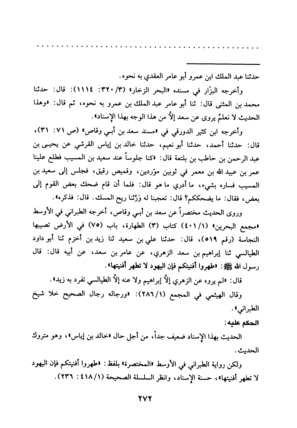 ولكن رواية الطبراني في الأوسط "المختصرة" بلفظ: "طهروا أفنيتكم فإن اليهود لا تطهير أفنيتها"، حسنة الإسناد، وانظر السلسلة الصحيحة (1/ 418: 236). =