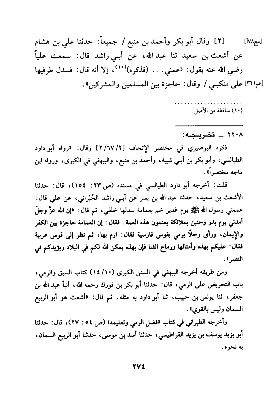قلت: أخرجه أبو داود الطيالسي في مسنده (ص 23: 154)، قال: حدّثنا الأشعث بن سعيد، حدّثنا عبد الله بن بسر عن أبي راشد الحُبراني، عن علي قال: عممني رسول الله -صلى الله عليه وسلم- يوم غَدِيرِ خُمٍّ بِعِمَامَةٍ سَدَلَهَا خَلْفِي، ثُمَّ قَالَ: "إن الله عزَّ وجلَّ أمدني يوم بدر وحنين بملائكة يعتمون هذه العمة. فقال: إن العمامة حاجزة بين الكفر والإيمان , ورأى رجلًا يرمي بقوس فارسية فقال: ارم بها، ثم نظر إلى قوس عربية فقال: عليكم بهذه وأمثالها ورماح القنا فإن بهذه يمكن الله لكم في البلاد وبؤيدكم في النصر".