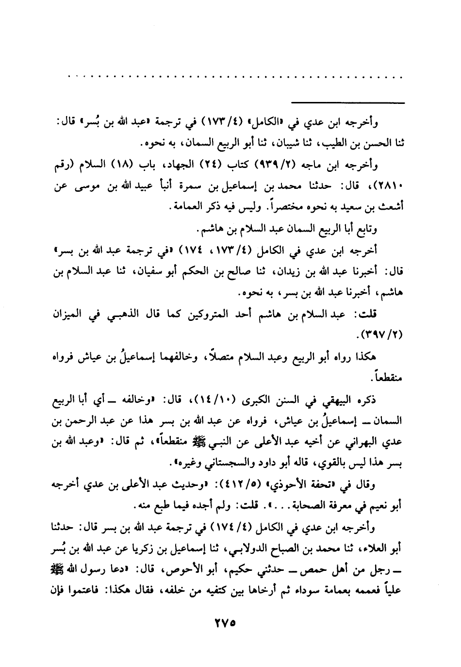 وأخرجه ابن عدي في الكامل (4/ 174) في ترجمة عبد الله بن بسر قال: حدّثنا أبو العلاء، ثنا محمَّد بن الصباح الدولابي، ثنا إسماعيل بن زكريا عن عبد الله بن بُسر -رجل من أهل حمص- حدثني حكيم، أبو الأحوص، قال: "دَعَا رَسُولُ اللَّهِ -صَلَّى اللَّهُ عَلَيْهِ وَسَلَّمَ- عليًا فعممه بعمامة سوداء ثم أرخاها بين كتفيه من خلفه، فقال هكذا: فاعتموا فإن =