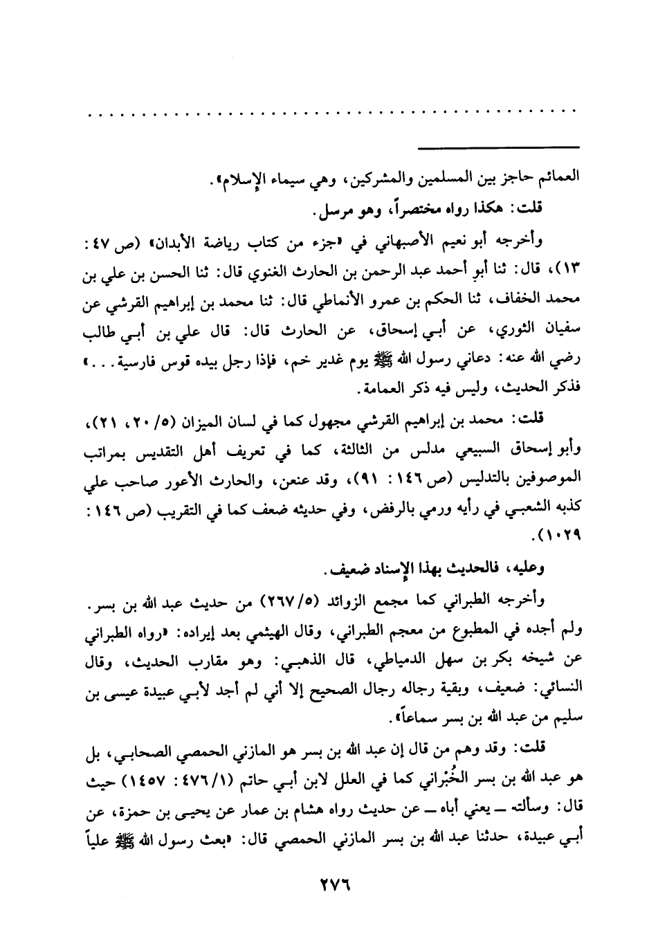 قلت: محمَّد بن إبراهيم القرشي مجهول كما في لسان الميزان (5/ 20، 21)، وأبو إسحاق السبيعي مدلس من الثالثة، كما في تعريف أهل التقديس بمراتب الموصوفين بالتدليس (ص 146: 91)، وقد عنعن، والحارث الأعور صاحب علي كذبه الشعبي في رأيه ورمي بالرفض، وفي حديثه ضعف كما في التقريب (ص 146: 1029).
