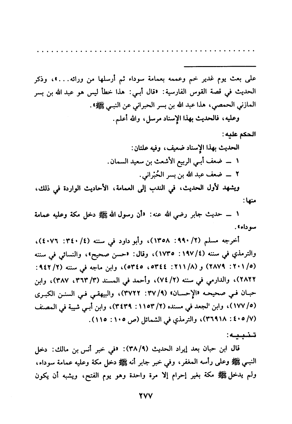 = على بعث يوم غدير خم وعممه بعمامة سوداء ثم أرسلها من ورائه ... "، وذكر الحديث في قصة القوس الفارسية: "قال أبي: هذا خطأ ليس هو عبد الله بن بسر المازني الحمصي، هذا عبد الله بن بسر الحبراني عن النبي -صلى الله عليه وسلم- ".