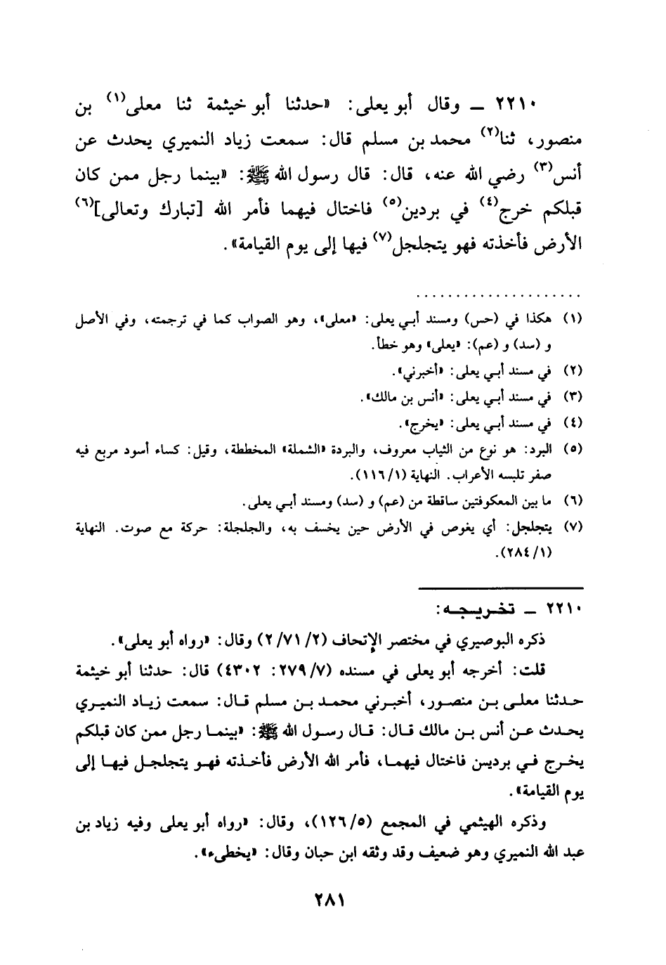 2210 - وَقَالَ أَبُو يَعْلَى حَدَّثَنَا أَبُو خَيْثَمَةَ ثنا مُعَلَّى بْنُ مَنْصُورٍ ثنا مُحَمَّدُ بْنُ مُسْلِمٍ قَالَ سَمِعْتُ زِيَادَ النُّمَيْرِيَّ يُحَدِّثُ عَنْ أَنَسٍ رَضِيَ الله عَنْهُ قَالَ قَالَ رَسُولُ اللَّهِ صَلَّى اللَّهُ عَلَيْهِ وَسَلَّمَ §بَيْنَمَا رَجُلٌ مِمَّنْ كَانَ قَبْلَكُمْ خَرَجَ فِي بُرْدَيْنِ فَاخْتَالَ فِيهِمَا فَأَمَرَ اللَّهُ تَبَارَكَ وَتَعَالَى الْأَرْضَ فَأَخَذَتْهُ فَهُوَ يَتَجَلْجَلُ فِيهَا إِلَى يَوْمِ الْقِيَامَةِ