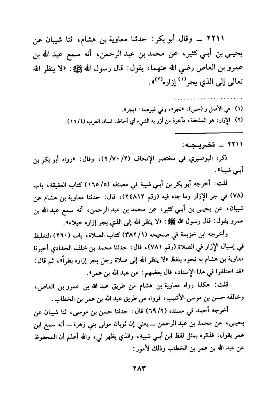 2211 - وَقَالَ أَبُو بَكْرٍ حَدَّثَنَا مُعَاوِيَةُ بْنُ هِشَامٍ ثنا شَيْبَانُ عَنْ يَحْيَى بْنِ أَبِي كَثِيرٍ عَنْ مُحَمَّدِ بْنِ عَبْدِ الرَّحْمَنِ أَنَّهُ سَمِعَ عَبْدَ اللَّهِ بْنَ عَمْرِو بْنِ الْعَاصِ رَضِيَ الله عَنْهُمَا يَقُولُ قَالَ رَسُولُ اللَّهِ صَلَّى اللَّهُ عَلَيْهِ وَسَلَّمَ §لَا يَنْظُرُ اللَّهُ تَعَالَى إِلَى الَّذِي يَجُرُّ إِزَارَهُ