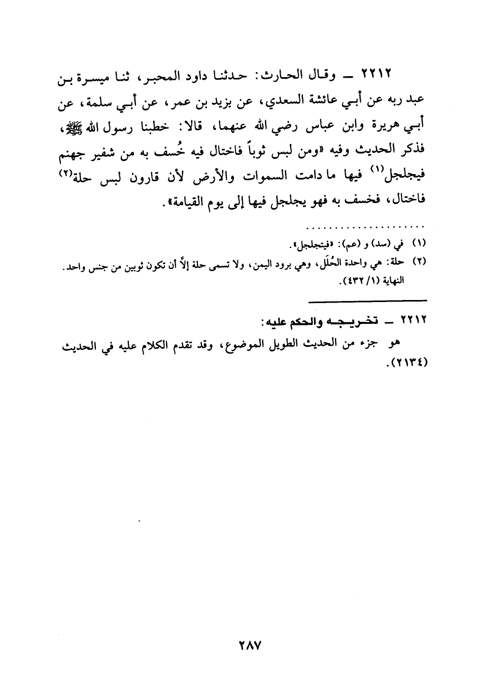 2212 - وَقَالَ الْحَارِثُ حَدَّثَنَا دَاوُدُ الْمُحَبَّرِ ثنا مَيْسَرَةُ بْنُ عَبْدِ رَبِّهِ عَنْ أَبِي عَائِشَةَ السَّعْدِيِّ عَنْ يزيد بن عمر عَنْ أَبِي سَلَمَةَ عَنْ أَبِي هُرَيْرَةَ وَابْنِ عَبَّاسٍ رَضِيَ الله عَنْهُمَا قَالَا خَطَبَنَا رَسُولُ اللَّهِ صَلَّى اللَّهُ عَلَيْهِ وَسَلَّمَ فَذَكَرَ الْحَدِيثَ وَفِيهِ §وَمَنْ لَبِسَ ثَوْبًا فَاخْتَالَ فِيهِ خُسِفَ بِهِ مِنْ شَفِيرِ جَهَنَّمَ فَيُجَلْجِلُ فِيهَا مَا دَامَتِ السموات وَالْأَرْضُ لِأَنَّ قَارُونَ لَبِسَ حُلَّةً فَاخْتَالَ فَخُسِفَ بِهِ فَهُوَ يُجَلْجِلُ فِيهَا إِلَى يَوْمِ الْقِيَامَةِ