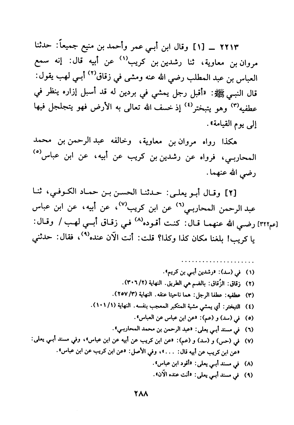 2213 - وَقَالَ ابْنُ أَبِي عُمَرَ وَأَحْمَدُ بْنُ مَنِيعٍ جيمعاً حَدَّثَنَا مَرْوَانُ بْنُ مُعَاوِيَةَ ثنا رِشْدِينُ بْنُ كُرَيْبٍ عَنْ أَبِيهِ قال إنَّهُ سَمِعَ الْعَبَّاسَ بْنَ عَبْدِ الْمُطَّلِبِ رَضِيَ اللَّهُ وَمَشَى فِي زُقَاقِ أَبِي لَهَبٍ يَقُولُ قَالَ النَّبِيُّ صَلَّى اللَّهُ عَلَيْهِ وَسَلَّمَ §أَقْبَلَ رَجُلٌ يَمْشِي فِي بُرْدَيْنِ لَهُ قَدْ أَسْبَلَ إِزَارَهُ يَنْظُرُ فِي عِطْفَيْهِ وَهُوَ يَتَبَخْتَرُ إِذْ خَسَفَ اللَّهُ تَعَالَى بِهِ الْأَرْضَ فَهُوَ يَتَجَلْجَلُ فِيهَا إِلَى يَوْمِ الْقِيَامَةِ هَكَذَا رَوَاهُ مَرْوَانُ بْنُ مُعَاوِيَةَ وَخَالَفَهُ عَبْدُ الرَّحْمَنِ بْنُ مُحَمَّدٍ الْمُحَارِبِي فَرَوَاهُ عَنْ رِشْدِينَ بْنِ كُرَيْبٍ عَنْ أَبِيهِ عَنِ ابْنِ عَبَّاسٍ رَضِيَ الله عَنْهُمَا