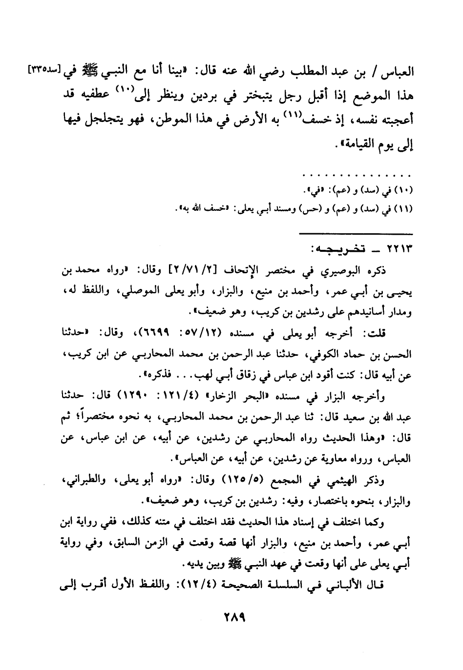 العباس بن عبد المطلب رضي الله عنه قَالَ: "بَيْنَا أَنَا مَعَ النَّبِيِّ -صَلَّى اللَّهُ عَلَيْهِ وَسَلَّمَ- فِي هذا الموضع إذا أَقْبَلَ رَجُلٌ يَتَبَخْتَرُ فِي بُرْدَيْنِ وَيَنْظُرُ إِلَى (¬10) عِطْفَيْهِ قَدْ أَعْجَبَتْهُ نَفْسُهُ، إِذْ خُسِفَ (¬11) بِهِ الْأَرْضُ فِي هَذَا الْمَوْطِنِ، فَهُوَ يَتَجَلْجَلُ فِيهَا إلى يوم القيامة".