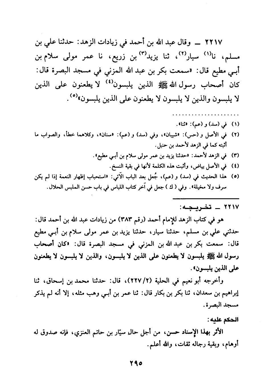 2217 - وَقَالَ عَبْدُ اللَّهِ بْنُ أَحْمَدَ فِي زِيَادَاتِ الزُّهْدِ حَدَّثَنَا عَلِيُّ بْنُ مُسْلِمٍ ونا سَيَّارٌ ثنا يَزِيدُ بْنُ زُرَيْعٍ ونا عُمَرُ مَوْلَى سَلَّامِ بْنِ أَبِي مُطِيعٍ قَالَ سَمِعْتُ بَكْرَ بْنَ عَبْدِ اللَّهِ الْمُزَنِيَّ فِي مَسْجِدِ الْبَصْرَةِ قَالَ كَانَ أَصْحَابُ رَسُولِ اللَّهِ صَلَّى اللَّهُ عَلَيْهِ وَسَلَّمَ §الَّذِينَ يَلْبَسُونَ لَا يَطْعَنُونَ عَلَى الَّذِينَ لَا يَلْبَسُونَ وَالَّذِينَ لَا يَلْبَسُونَ لَا يَطْعَنُونَ عَلَى الَّذِينَ يَلْبَسُونَ