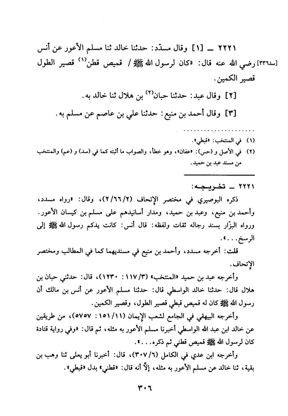 2221 - وَقَالَ مُسَدَّدٌ حَدَّثَنَا خَالِدٌ ثنا مُسْلِمٌ الْأَعْوَرُ عَنْ أَنَسٍ رَضِيَ الله عَنْهُ قَالَ §كَانَ لِرَسُولِ اللَّهِ صَلَّى اللَّهُ عَلَيْهِ وَسَلَّمَ قَمِيص قُطْنٍ قَصِيرُ الطُّولِ قَصِيرُ الْكُمَّيْنِ وَقَالَ عَبْدٌ حَدَّثَنَا حَبَّانُ بْنُ هِلَالٍ ثنا خَالِدٌ بِهِ وَقَالَ أَحْمَدُ بْنُ مَنِيعٍ حَدَّثَنَا عَلِيُّ بْنُ عَاصِمٍ عَنْ مُسْلِمٍ بِهِ