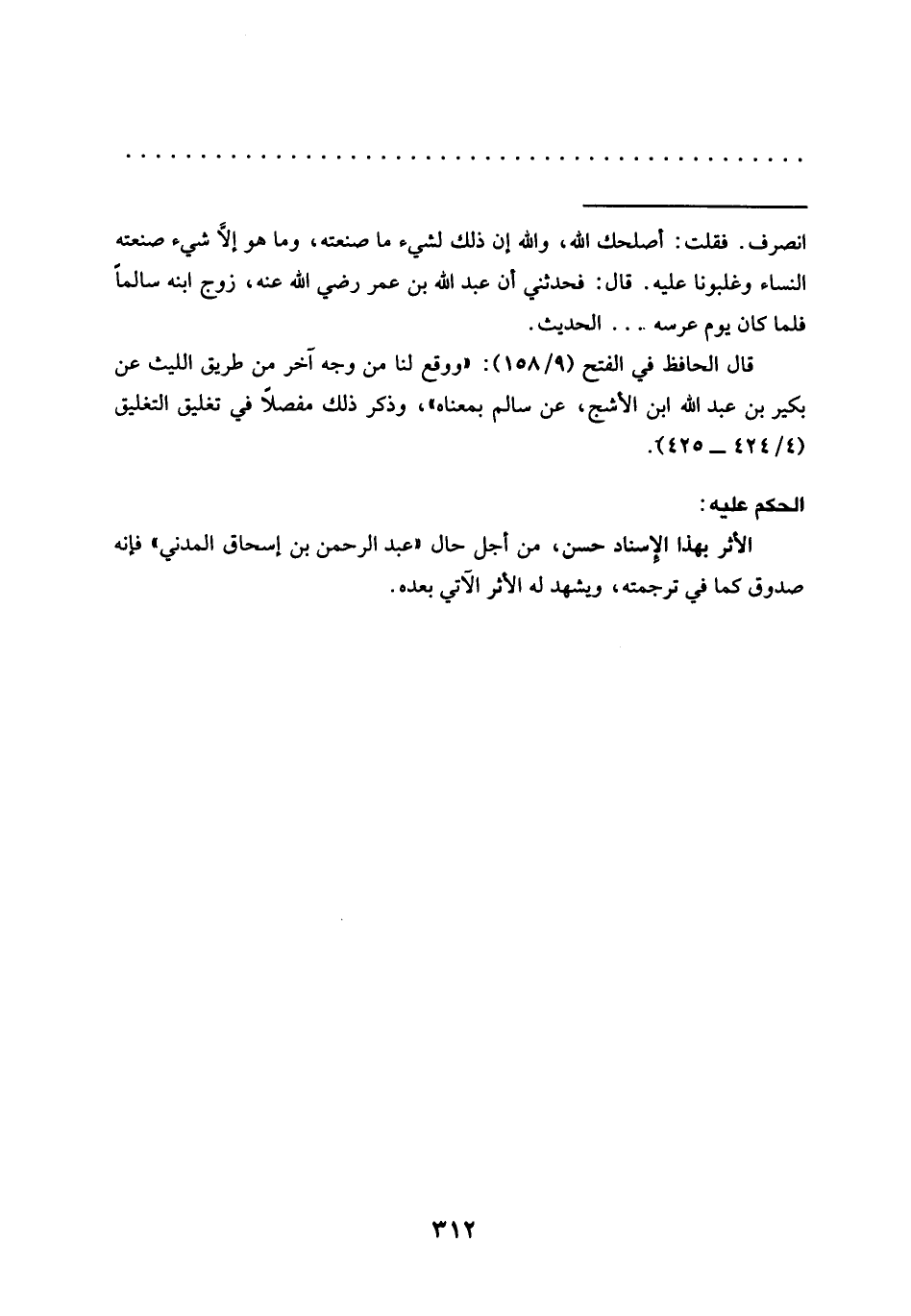 = انصرف. فقلت: أصلحك الله، والله إن ذلك لشيء ما صنعته، وما هو إلَّا شيء صنعته النساء وغلبونا عليه. قال: فحدثني أن عبد الله بن عمر رضي الله عنه، زوج ابنه سالمًا فلما كان يوم عرسه .... الحديث.