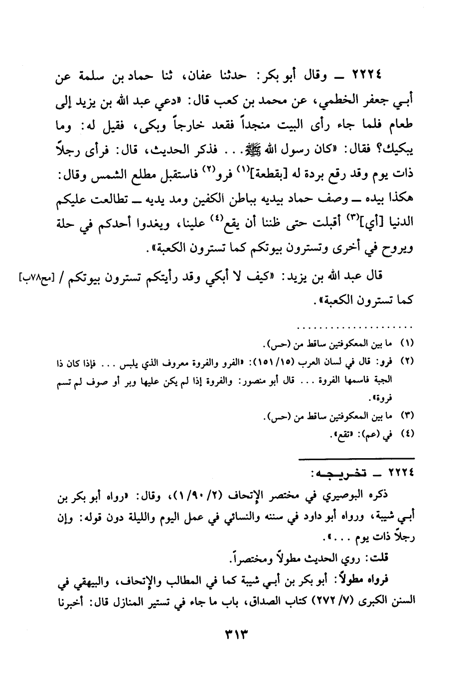 2224 - وَقَالَ أَبُو بَكْرٍ حَدَّثَنَا عَفَّانُ ثنا حَمَّادُ بْنُ سَلَمَةَ عَنْ أَبِي جَعْفَرٍ الْخَطْمِيِّ عَنْ مُحَمَّدِ بْنِ كَعْبٍ قَالَ دُعِيَ عَبْدُ اللَّهِ بْنُ يَزِيدَ إِلَى طَعَامٍ فَلَمَّا جَاءَ رَأَى الْبَيْتَ مُنَجَّدًا فَقَعَدَ خَارِجًا وَبَكَى فَقِيلَ لَهُ وَمَا يُبْكِيكَ فَقَالَ كَانَ رَسُولُ اللَّهِ صَلَّى اللَّهُ عَلَيْهِ وَسَلَّمَ ... فَذَكَرَ الْحَدِيثَ قَالَ فَرَأَى رَجُلًا ذَاتَ يَوْمٍ وَقَدْ رَقَعَ بُرْدَةً لَهُ بِقِطْعَةِ فَرْوٍ فَاسْتَقْبَلَ مَطْلَعَ الشَّمْسِ وَقَالَ هَكَذَا بِيَدِهِ وَصَفَ حَمَّادٌ بِيَدَيْهِ بِبَاطِنِ الْكَفَّيْنِ وَمَدَّ يَدَيْهِ §تَطَالَعَتْ عَلَيْكُمُ الدُّنْيَا أَيْ أَقْبَلَتْ حَتَّى ظَنَنَّا أَنْ يَقَعُ عَلَيْنَا ويغدو أَحَدُكُمْ فِي حُلَّةٍ وَيَرُوحُ فِي أُخْرَى وَتَسْتُرُونَ بُيُوتَكُمْ كَمَا تَسْتُرُونَ الْكَعْبَةُ قَالَ عَبْدُ اللَّهِ بْنُ يَزِيدَ كَيْفَ لَا أَبْكِي وَقَدْ رَأَيْتُكُمْ تسترون بيوتكم كم تَسْتُرُونَ الْكَعْبَةَ