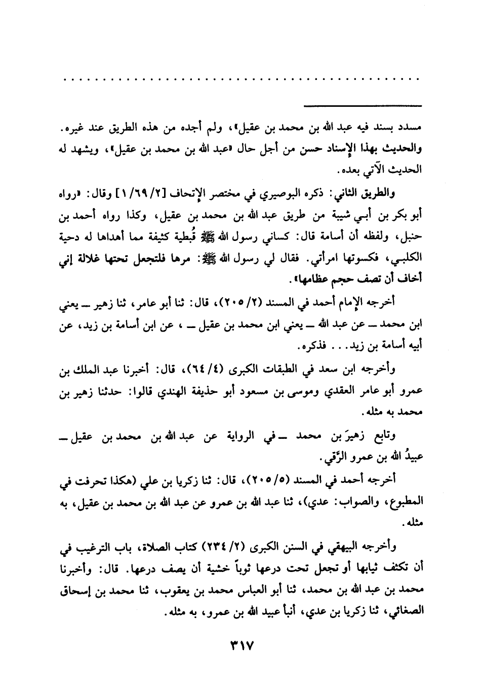 والطريق الثاني: ذكره البوصيري في مختصر الإتحاف [2/ 169/1] وقال: "رواه أبو بكر بن أبي شيبة مِنْ طَرِيقِ عَبْدِ اللَّهِ بْنِ محمَّد بْنِ عقيل، وكذا رواه أحمد بن حنبل، ولفظه أن أسامة قال: كساني رسول الله -صلى الله عليه وسلم- قُبطية كثيفة مما أهداها له دحية الكلبي، فكسوتها امرأتي. فَقَالَ لِي رَسُولُ اللَّهِ -صَلَّى اللَّهُ عَلَيْهِ وسلم-: مرها فلتجعل تحتها غلالة إني أخاف أن تصف حجم عظامها".