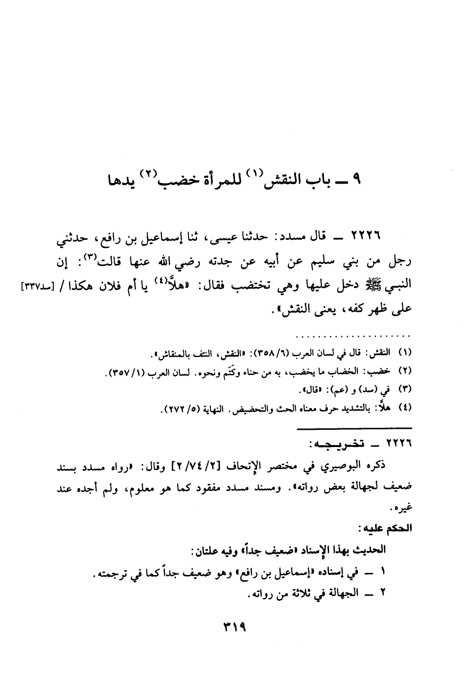2226 - قَالَ مُسَدَّدٌ حَدَّثَنَا عِيسَى ثنا إِسْمَاعِيلُ بْنُ رَافِعٍ حَدَّثَنِي رَجُلٌ مِنْ بَنِي سُلَيْمٍ عَنْ أَبِيهِ عَنْ جَدَّتِهِ رَضِيَ الله عَنْهِا قَالَتْ إِنَّ النَّبِيَّ صَلَّى اللَّهُ عَلَيْهِ وَسَلَّمَ دَخَلَ عَلَيْهَا وَهِيَ تَخْتَضِبُ فَقَالَ §هَلَّا يَا أُمَّ فُلَانٍ هَكَذَا عَلَى ظَهْرِ كَفِّهِ يَعْنِي النَّقْشَ