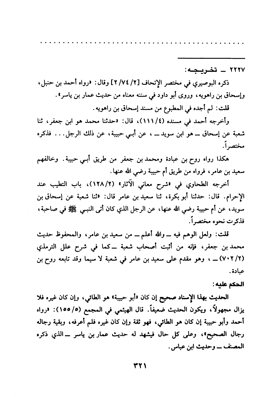 أخرجه الطحاوي في "شرح معاني الآثار" (2/ 128)، باب التطيب عند الإحرام. قال: حدّثنا أبو بكرة، ثنا سعيد بن عامر قال: "ثنا شعبة عن إسحاق بن سويد، عن أم حبيبة رضي الله عنها، عن الرجل الذي كان أَتَى النَّبِيَّ -صَلَّى اللَّهُ عَلَيْهِ وَسَلَّمَ- فِي صاحبة، فذكرت نحوه مختصرًا.