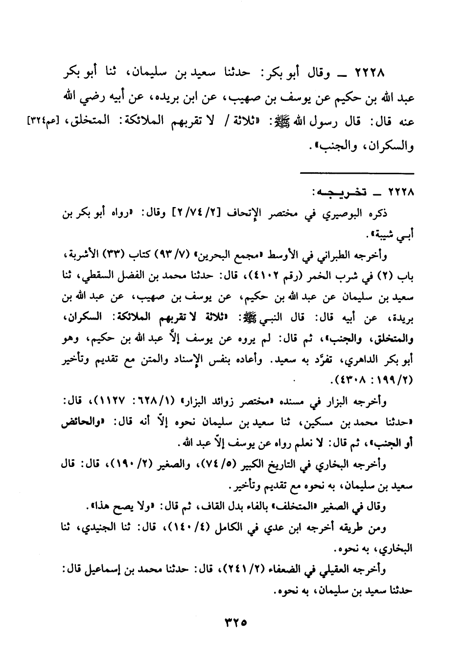 2228 - وَقَالَ أَبُو بَكْرٍ حَدَّثَنَا سَعِيدُ بْنُ سُلَيْمَانَ ثنا أَبُو بَكْرٍ عَبْدُ اللَّهِ بْنُ حَكِيمٍ عَنْ يُوسُفَ بْنِ صُهَيْبٍ عَنِ ابْنِ بُرَيْدَةَ عَنْ أَبِيهِ رَضِيَ الله عَنْهُ قَالَ قَالَ رَسُولُ اللَّهِ صَلَّى اللَّهُ عَلَيْهِ وَسَلَّمَ §ثَلَاثَةٌ لَا تَقْرَبُهُمُ الْمَلَائِكَةُ الْمُتَخَلِّقُ وَالسَّكْرَانُ وَالْجُنُبُ