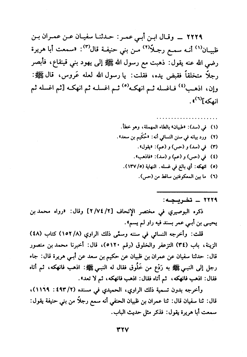 2229 - وَقَالَ ابْنُ أَبِي عُمَرَ حَدَّثَنَا سُفْيَانُ عَنْ عِمْرَانَ بْنِ ظَبْيَانَ أَنَّهُ سَمِعَ رَجُلًا مِنْ بَنِي حَنِيفَةَ قَالَ سَمِعْتُ أَبَا هُرَيْرَةَ رَضِيَ الله عَنْهُ يَقُولُ ذَهَبْتُ مَعَ رَسُولِ اللَّهِ صَلَّى اللَّهُ عَلَيْهِ وَسَلَّمَ إِلَى يَهُودِ بَنِي قَيْنُقَاعٍ فَأَبْصَرَ رَجُلًا مُتَخَلِّقًا فَقَبَضَ يَدَهُ فَقُلْتُ يَا رَسُولَ اللَّهِ لَعَلَّهُ عَرُوسٌ قَالَ صَلَّى اللَّهُ عَلَيْهِ وَسَلَّمَ وَإِنْ §اذْهَبْ فَاغْسِلْهُ ثُمَّ أَنْهِكْهُ ثُمَّ اغْسِلْهُ ثُمَّ أَنْهِكْهُ ثُمَّ اغْسِلْهُ ثُمَّ أَنْهِكْهُ