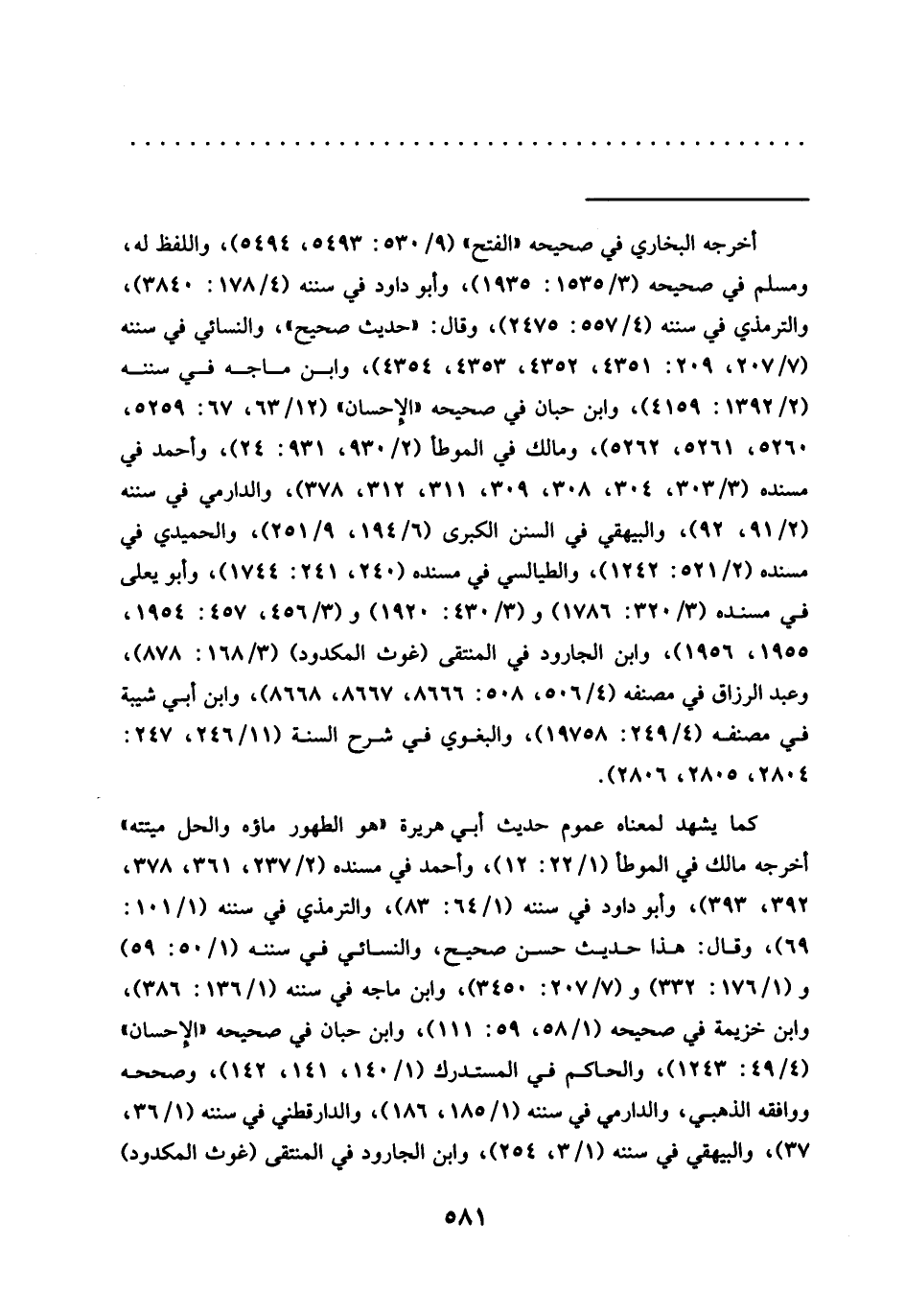 كما يشهد لمعناه عموم حديث أبي هريرة "هو الطهور ماؤه والحل ميتته" أخرجه مالك في الموطأ (1/ 22: 12)، وأحمد في مسنده (2/ 237، 361، 378، 392، 393)، وأبو داود في سننه (1/ 64: 83)، والترمذي في سننه (1/ 101: 69)، وقال: هذا حديث حسن صحيح، والنسائي في سننه (1/ 50: 59) و (1/ 176: 332) و (7/ 207: 3450)، وابن ماجه في سننه (1/ 136: 386)، وابن خزيمة في صحيحه (1/ 58، 59: 111)، وابن حبّان في صحيحه "الإحسان" (4/ 49: 1243)، والحاكم في المستدرك (1/ 140، 141، 142)، وصححه ووافقه الذهبي، والدارمي في سننه (1/ 185، 186)، والدارقطني في سننه (1/ 36، 37)، والبيهقي في سننه (1/ 3، 254)، وابن الجارود في المنتقى (غوث المكدود) =