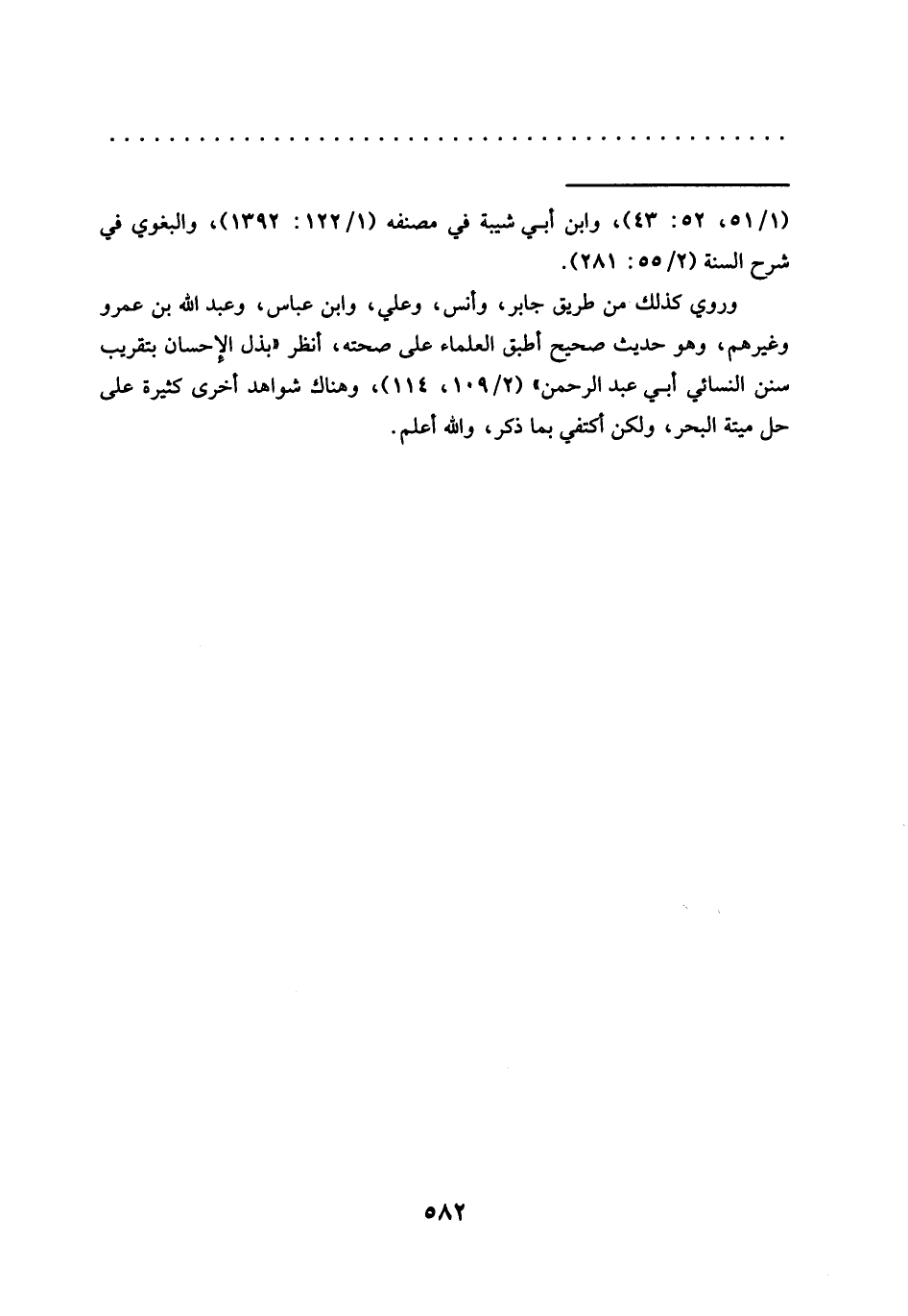 وروي كذلك من طريق جابر، وأنس، وعلي، وابن عباس، وعبد الله بن عمرو وغيرهم، وهو حديث صحيح أطبق العلماء على صحته، انظر "بذل الإحسان بتقريب سنن النسائي أبي عبد الرحمن" (2/ 109، 114)، وهناك شواهد أخرى كثيرة على حل ميتة البحر، ولكن أكتفي بما ذكر، والله أعلم.