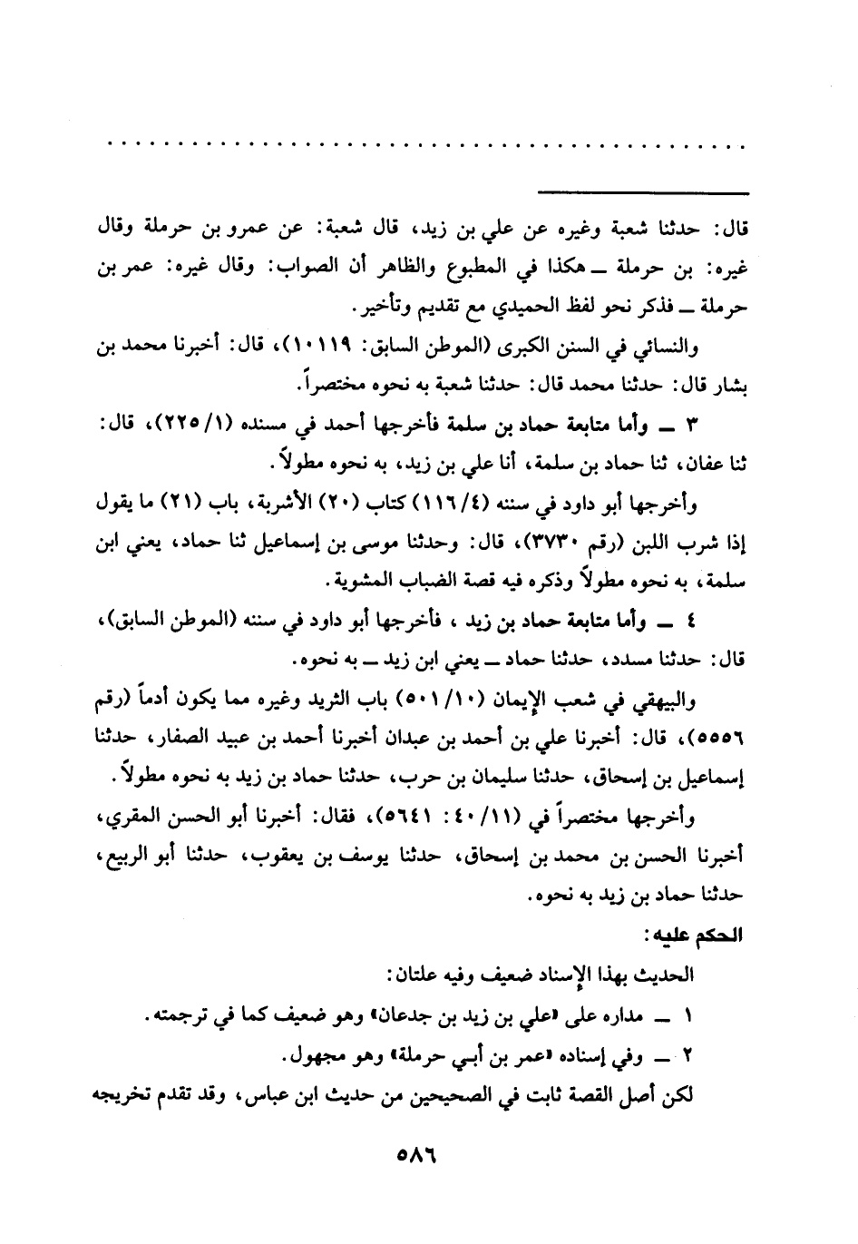 = قال: حدّثنا شعبة وغيره عن علي بن زيد، قال شعبة: عن عمرو بن حرملة وقال غيره: بن حرملة -هكذا في المطبوع والظاهر أن الصواب: وقال غيره: عمر بن حرملة- فذكر نحو لفظ الحميدي مع تقديم وتأخير.