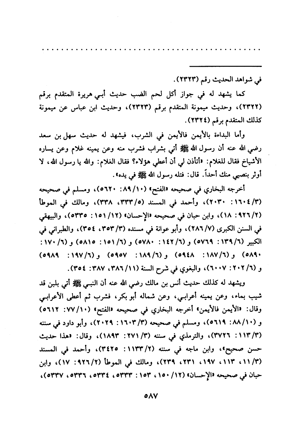 ويشهد له كذلك حديث أَنَسِ بْنِ مَالِكٍ رَضِيَ اللَّهُ عَنْهُ أَنَّ النبي -صلى الله عليه وسلم- أتى بلبن قد شيب بماء، وعن يمينه أعرابي، وعن شماله أبو بكر، فشرب ثم أعطى الأعرابي وقال: "الأيمن فالأيمن" أخرجه البخاري في صحيحه "الفتح" (10/ 77: 5612) و (10/ 88: 5619)، ومسلم في صحيحه (3/ 1603: 2029)، وأبو داود في سننه (3/ 113: 3726)، والترمذي في سننه (3/ 271: 1893)، وقال: "هذا حديث حسن صحيح"، وابن ماجه في سننه (2/ 1133: 3425)، وأحمد في المسند (3/ 11، 113، 197، 231، 239)، ومالك في الموطأ (2/ 926: 17)، وابن حبّان في صحيحه "الإحسان" (12/ 150، 153: 5333، 5334، 5336، 5337)، =